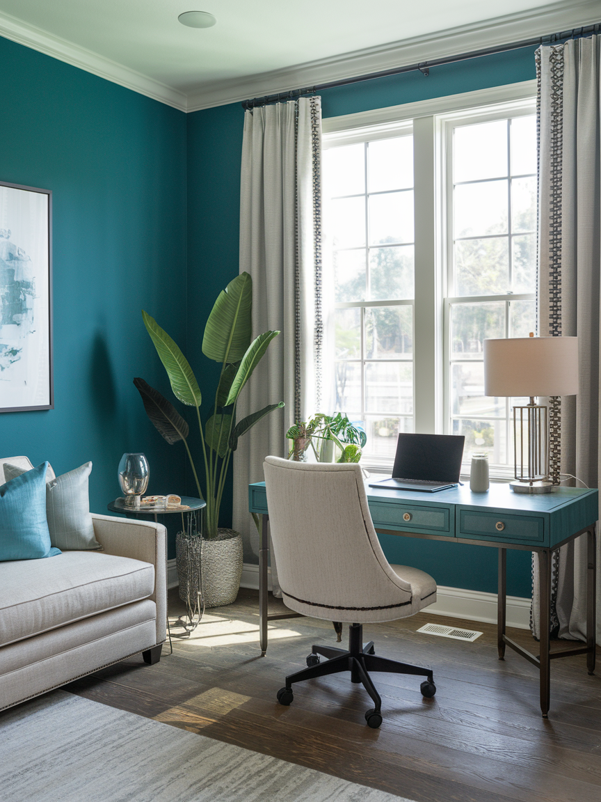 Energizing teal strikes the perfect balance between calm and vitality. Combining the serenity of blue with the freshness of green, teal stimulates alertness while maintaining composure. It’s an excellent backdrop for brainstorming, strategy sessions, or creative development. Teal’s rich dimension adds visual interest to video calls and daily routines alike. Pair it with natural wood, matte black fixtures, or woven textures to create a contemporary office that feels vibrant, confident, and inspiring.