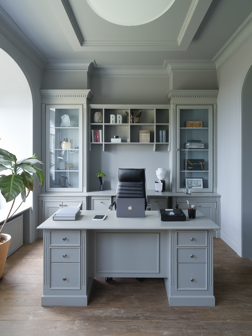 Light gray offers structure without sterility. Unlike stark white, which can feel harsh, or darker grays that may feel heavy, this softer tone creates a balanced, modern backdrop. It supports clarity and logical thinking—ideal for analytical tasks, data-driven projects, or strategic planning. Because it subtly fades into the background, light gray allows your ideas and work materials to stand out. Add black metal details, navy accents, or sleek furnishings to give the space dimension while maintaining a calm, professional atmosphere that feels polished yet welcoming.
