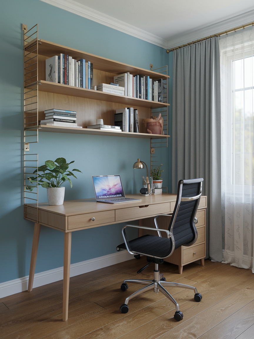 Sky blue mirrors the openness of a clear day, encouraging mental clarity and steady concentration. Blue tones are often associated with calm focus, and this lighter variation keeps the room feeling bright and breathable. It’s particularly effective for writers, designers, and developers who need to sustain deep, uninterrupted thought. When paired with white shelving, pale wood flooring, or subtle coastal textures, sky blue creates an environment that feels expansive rather than confined. The airy quality helps reduce mental clutter, making it easier to organize your thoughts and move confidently through your tasks.
