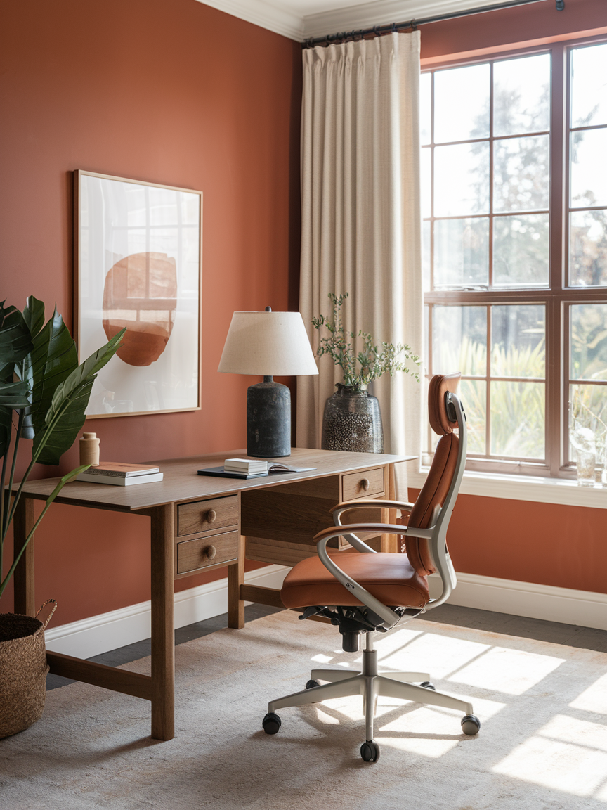Sunwashed terracotta introduces warmth and earthy vibrancy into your home office. This grounded, clay-inspired shade radiates comfort while gently energizing the space. It’s ideal if your workspace feels dull or lacks personality, as it instantly adds depth and character. In rooms with abundant natural light, terracotta develops a beautiful glow that shifts throughout the day. Pair it with black accents, creamy whites, or natural wood finishes for a cozy yet inspiring setup. It’s especially suited for creatives who thrive in emotionally rich, welcoming environments.