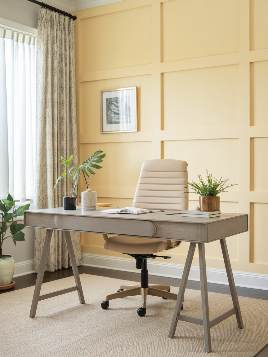Soft butter yellow captures the gentle optimism of early morning sunlight. Unlike bright yellow, which can feel overstimulating, this muted version delivers warmth without distraction. It’s perfect for boosting mood during darker seasons or energizing early work hours. This color subtly combats sluggishness and promotes a positive mindset. Styled with botanical prints, white cabinetry, and light wood accents, butter yellow creates a cheerful workspace that encourages productivity while maintaining visual softness.