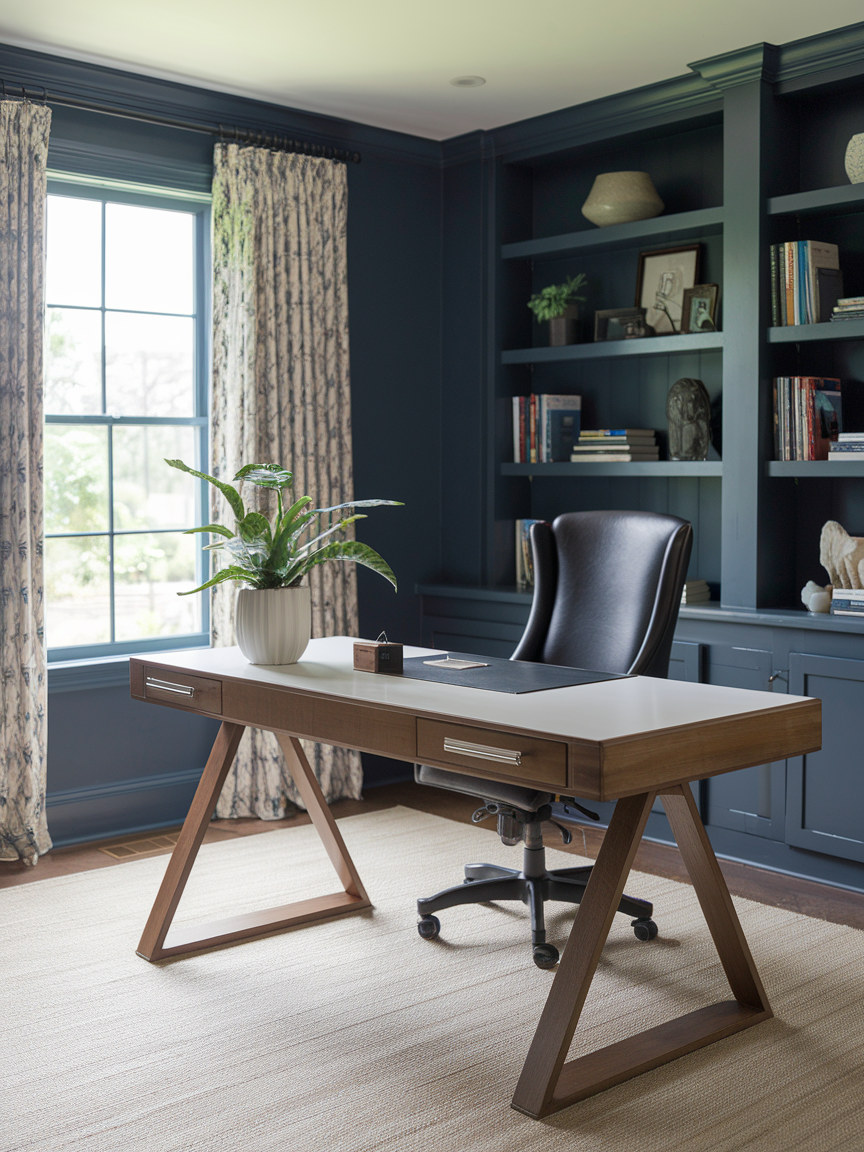 Muted navy blue delivers sophistication and depth. It signals focus and intention, making it an excellent choice for professionals who want their home office to feel refined and commanding. The darker tone also reduces glare from screens, helping minimize eye strain during long work sessions. Balance the richness of navy with brass hardware, crisp white trim, or minimalist artwork. The result is a workspace that feels grounded, confident, and distinctly professional—ideal for high-level thinking and important virtual meetings.