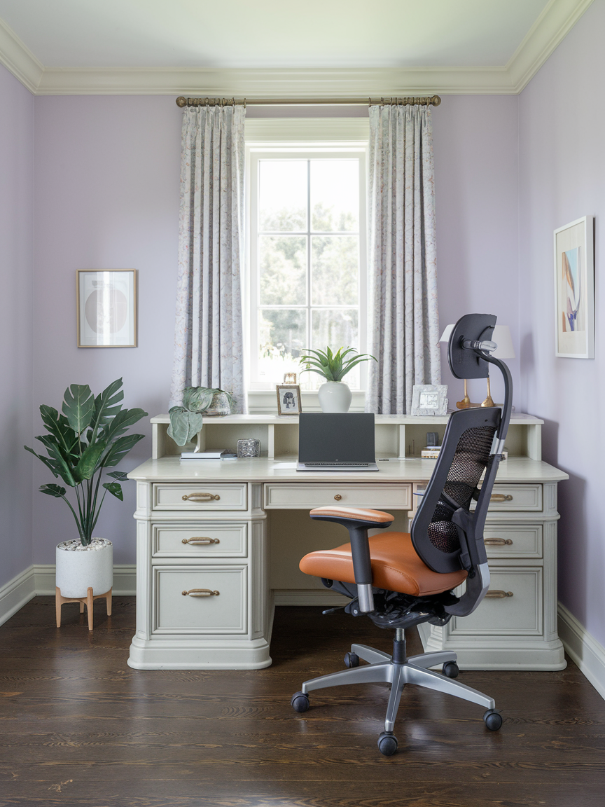 Pale lavender blends the calming influence of blue with the imaginative spark of purple. This soft, understated shade supports both analytical focus and creative exploration, making it ideal for multitaskers who shift between structured tasks and brainstorming sessions. Lavender introduces serenity without overpowering the room. Complement it with plush textiles, matte white finishes, and subtle metallic details for a refined yet peaceful atmosphere that keeps your mind balanced and inspired.