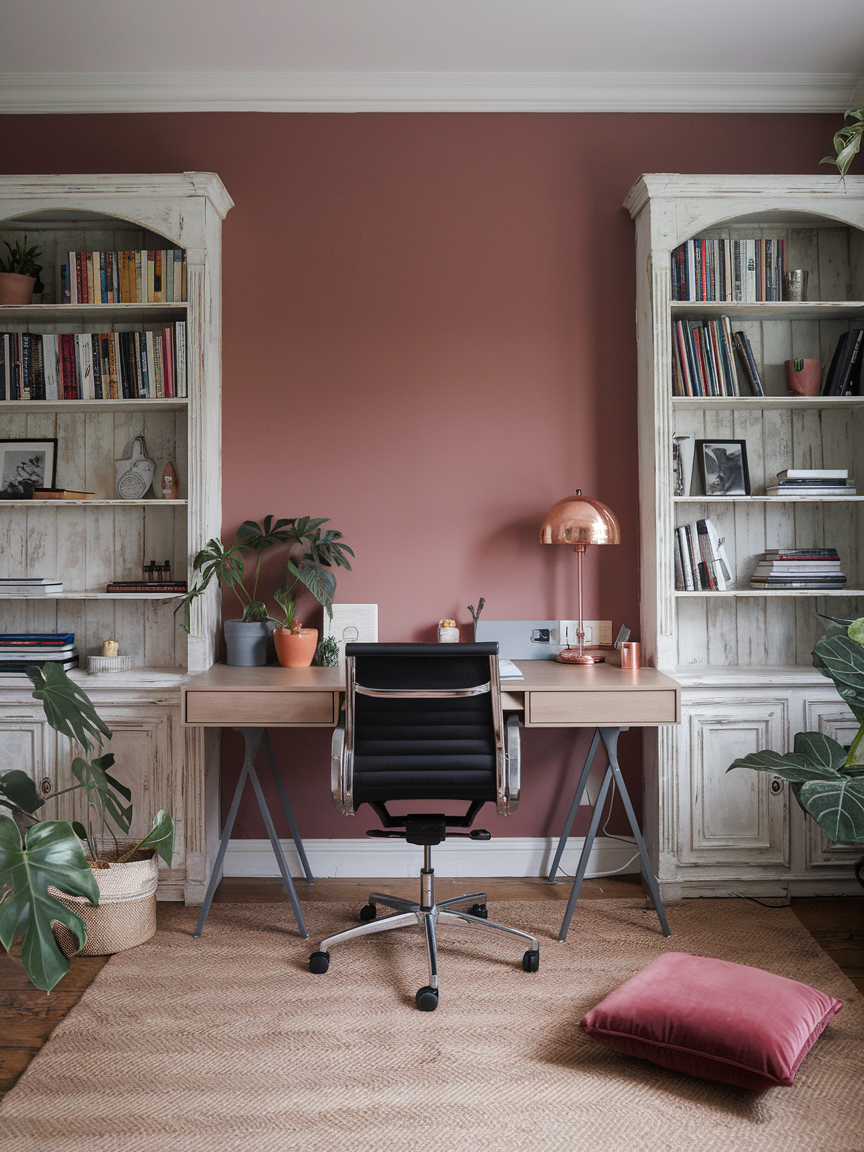 Dusty rose brings subtle warmth and emotional softness to a home office. This muted pink feels mature and grounded, adding personality without overwhelming the senses. It fosters reflection and calm communication, making it a lovely choice for coaches, writers, or client-facing professionals. Paired with copper accents, neutral furniture, and tactile fabrics like wool or velvet, dusty rose creates a comforting yet sophisticated environment where productivity and empathy coexist beautifully.