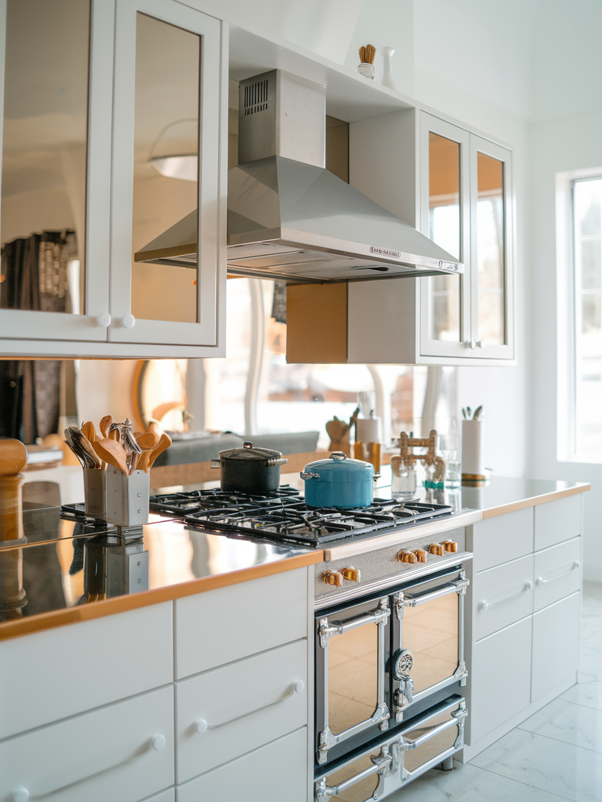 Mirrors and reflective surfaces are sneaky tricks to make a small kitchen feel larger. Glossy backsplashes, mirrored cabinet doors, or shiny countertops bounce light around the room, creating the illusion of depth. These surfaces also add a modern, polished look while keeping the space bright. Using reflective materials strategically highlights your kitchen’s best features. Once applied, mirrors and reflective finishes make even the tiniest kitchen feel open, elegant, and surprisingly airy, proving that a small footprint doesn’t mean sacrificing style.