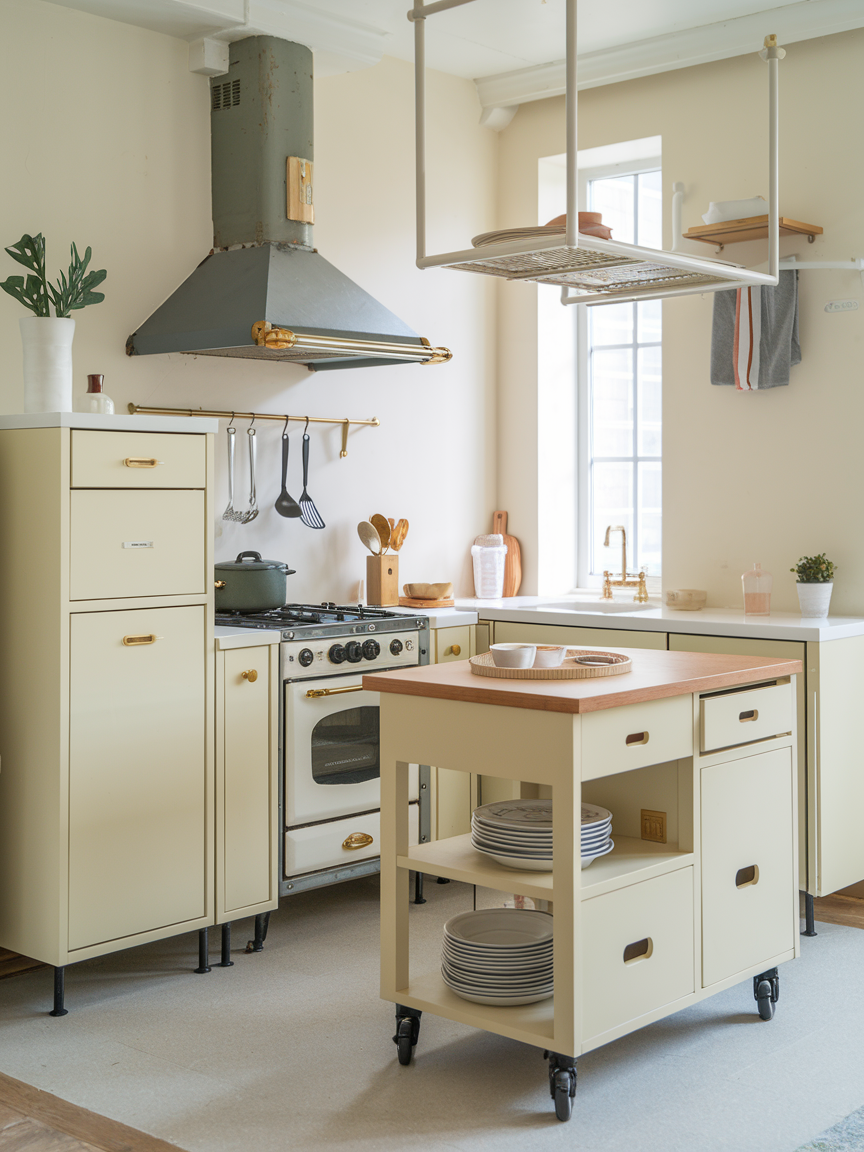 Pull-down hanging racks are an ingenious solution for storing pots, pans, or utensils above counters without taking up valuable space. These racks can be mounted on ceilings or walls and adjusted as needed. They free up cabinet space while keeping cookware easily accessible. With a stylish design, they also add a visual focal point to your kitchen. Once installed, pull-down racks make cooking smoother and more enjoyable because everything is right where you need it, and your small kitchen instantly feels organized, efficient, and full of personality.