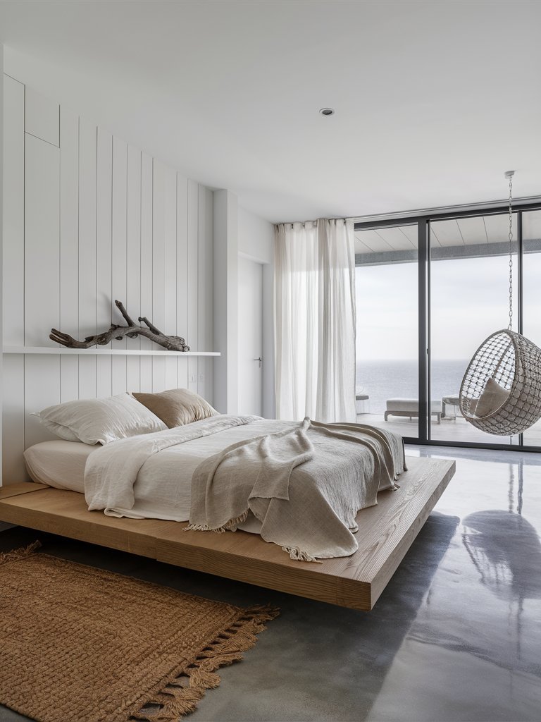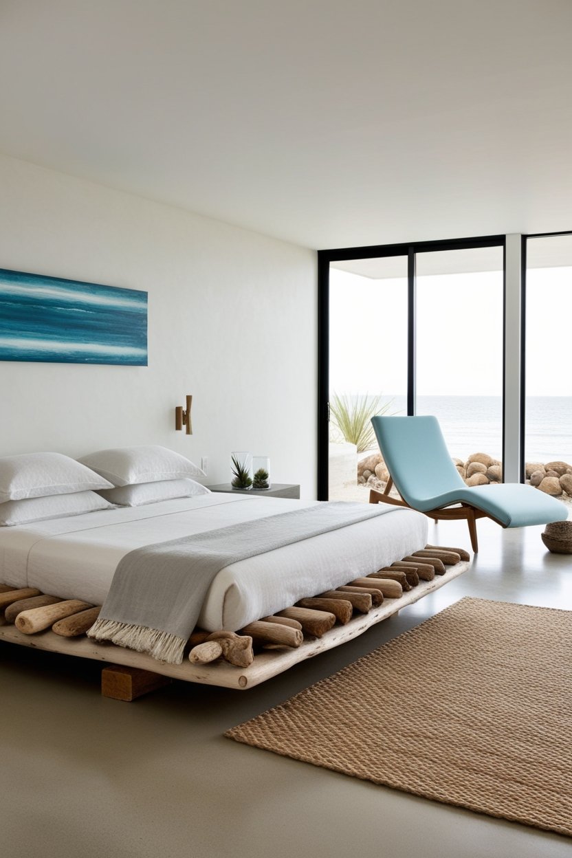 The low-profile platform bed serves as the focal point of this minimalist space, anchoring the room with its natural wood base and understated elegance. Its design pays homage to the calm, earthy tones of driftwood, a signature element of coastal aesthetics. The elevated frame adds visual lightness while maintaining practicality, ensuring the bed feels like it’s floating in the room.