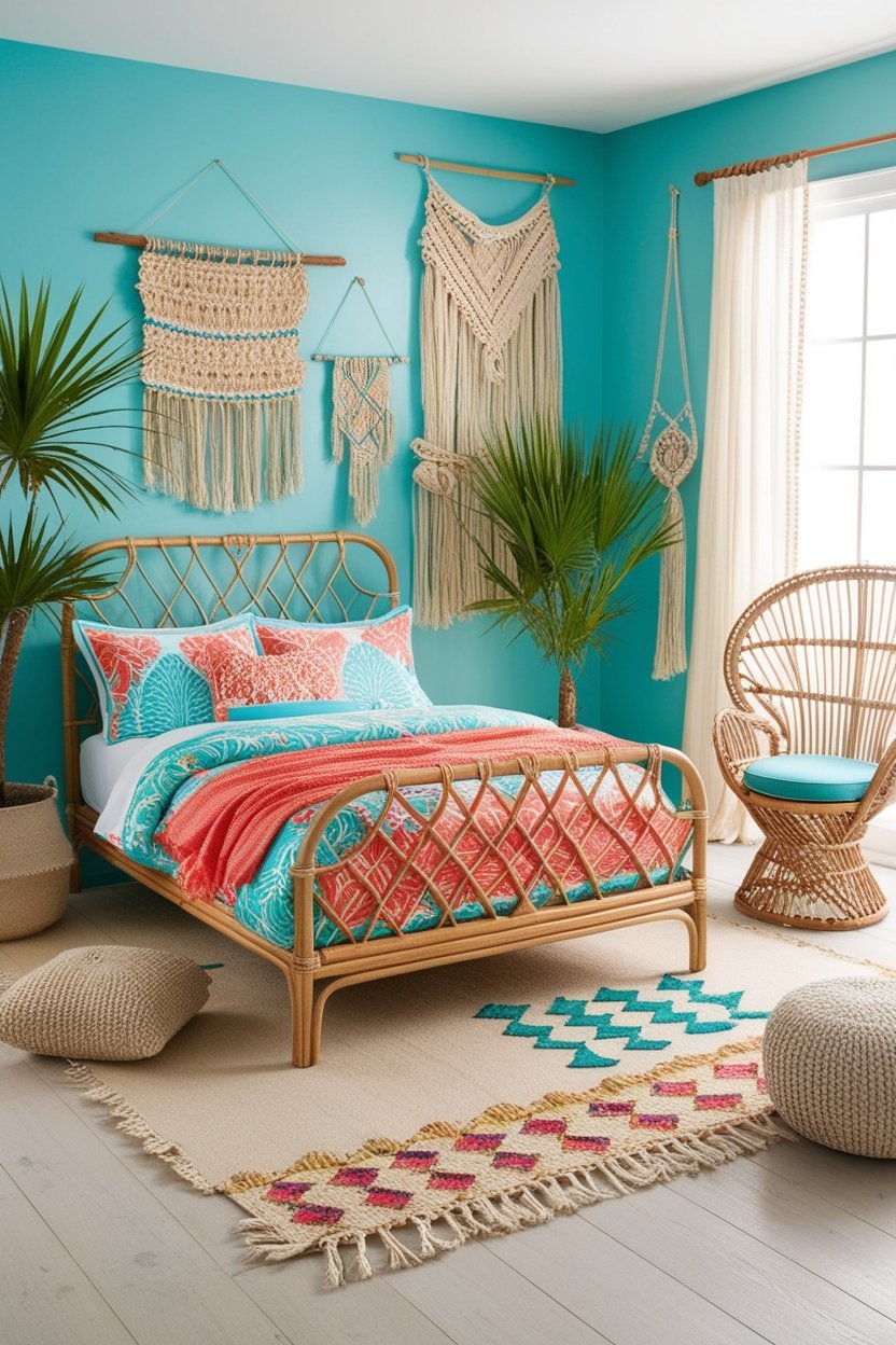 The wall above the bed is adorned with intricate macrame hangings that add texture and depth to the room. These handcrafted pieces introduce an element of artistry, enhancing the bohemian aesthetic. Their neutral tones balance the bright colors in the space, providing a harmonious backdrop that ties the natural and bold aspects of the decor together. Each macrame piece is unique, adding a sense of personality and individuality to the room. The use of these natural fibers further reinforces the connection to the coastal theme, making the space feel cohesive and thoughtfully designed.
