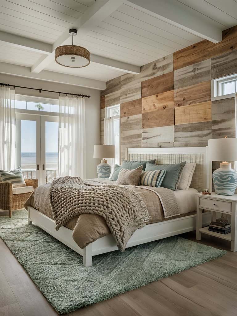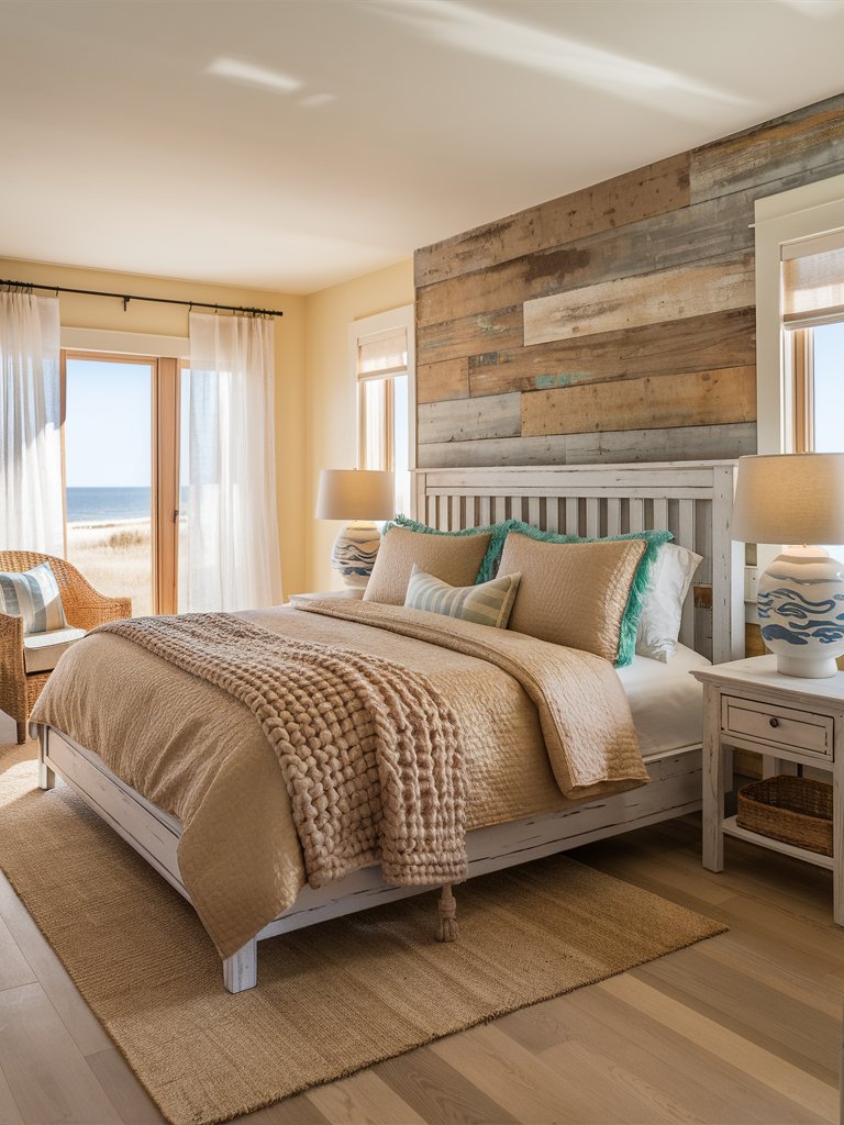 The reclaimed wood accent wall behind the bed serves as a striking feature, immediately grounding the space in a coastal theme. The mix of weathered textures and earthy tones mimics driftwood found along the shore, adding a rustic, organic feel to the room. This choice of material not only brings depth and texture to the space but also introduces a sense of history and connection to nature. The wall acts as a visual anchor for the room, drawing the eye and providing a natural backdrop that enhances the lighter elements in the decor.