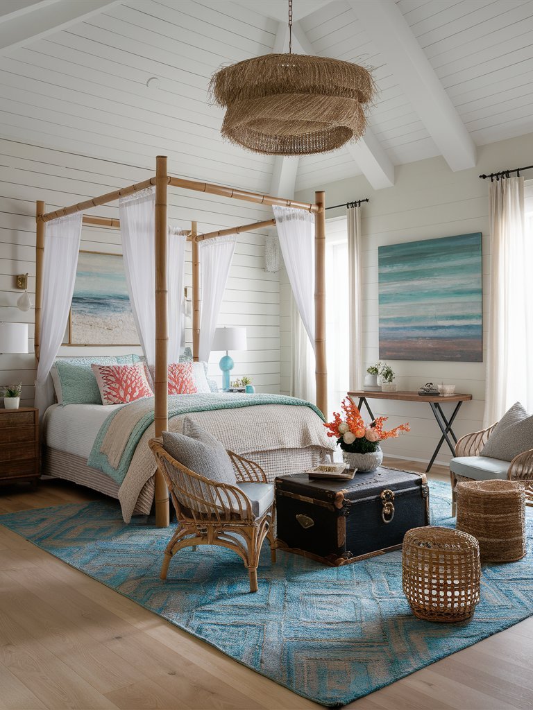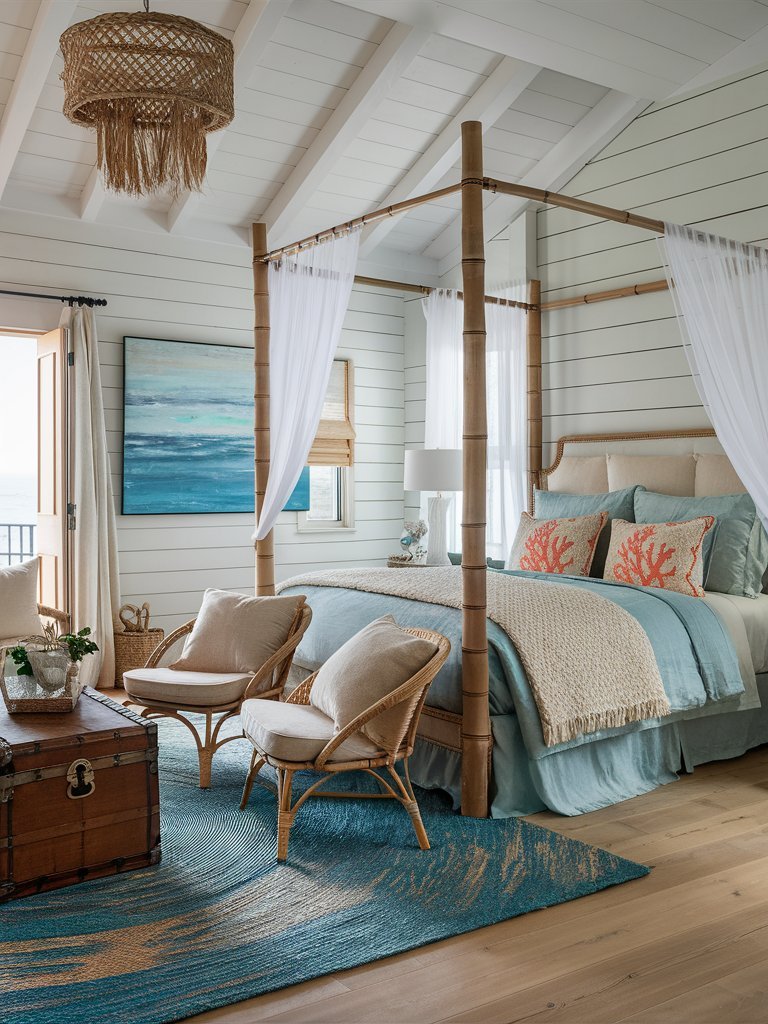 The bamboo canopy bed is the centerpiece of this room, bringing a natural, earthy charm that anchors the coastal theme. Its clean and minimalist structure is both visually striking and functional, while the bamboo material evokes the feeling of tropical getaways. Draped with sheer white curtains, the bed achieves a breezy, romantic vibe that is quintessentially coastal. These lightweight, semi-transparent curtains create movement in the space, enhancing the room’s relaxed, serene atmosphere.