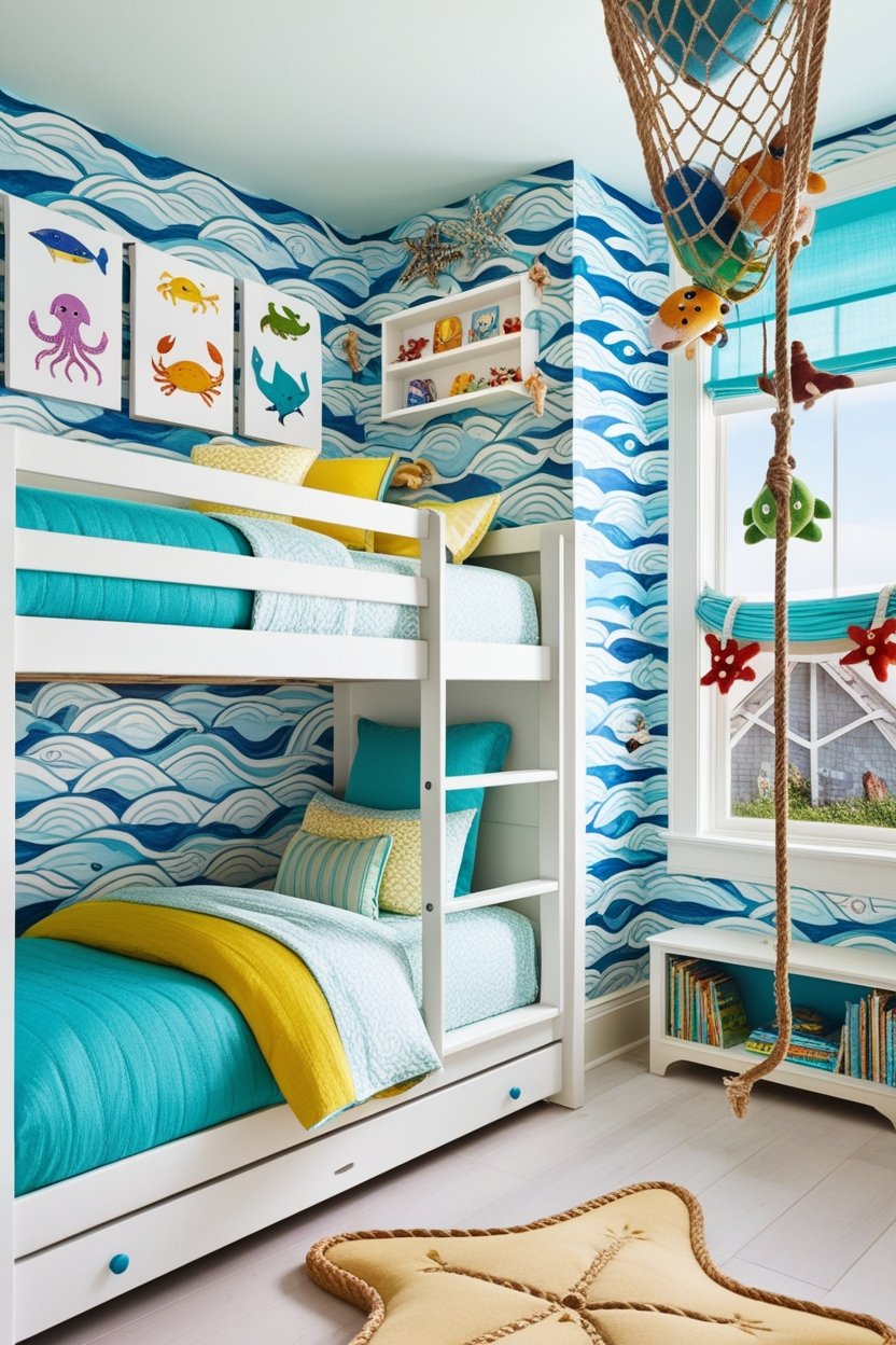 The wave-patterned wallpaper enveloping the room creates a bold and immersive coastal theme that immediately captures attention. Its intricate design, featuring layers of blue in various shades, mimics the rhythmic movement of ocean waves, bringing a sense of fluidity and dynamism to the space. The pattern adds depth and character, transforming a simple wall into a striking visual element. By wrapping the entire room in this vibrant design, the wallpaper establishes a cohesive and immersive seaside atmosphere, perfect for a children’s room.
