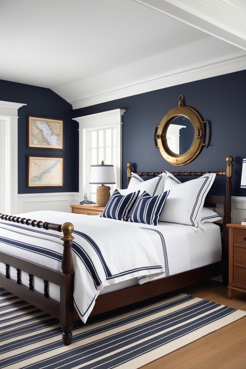 The circular mirror above the bed, framed in metallic brass, is a stunning nod to nautical aesthetics. Its design mimics a ship’s porthole, adding authenticity to the coastal theme. The mirror’s reflective surface enhances the room’s brightness by bouncing natural light around, while its bold metallic frame contrasts beautifully with the dark navy walls. This decorative piece serves both as a functional item and a thematic statement, bridging the gap between practicality and style. Its placement above the bed anchors the space and draws the eye upward, creating a sense of height and drama.