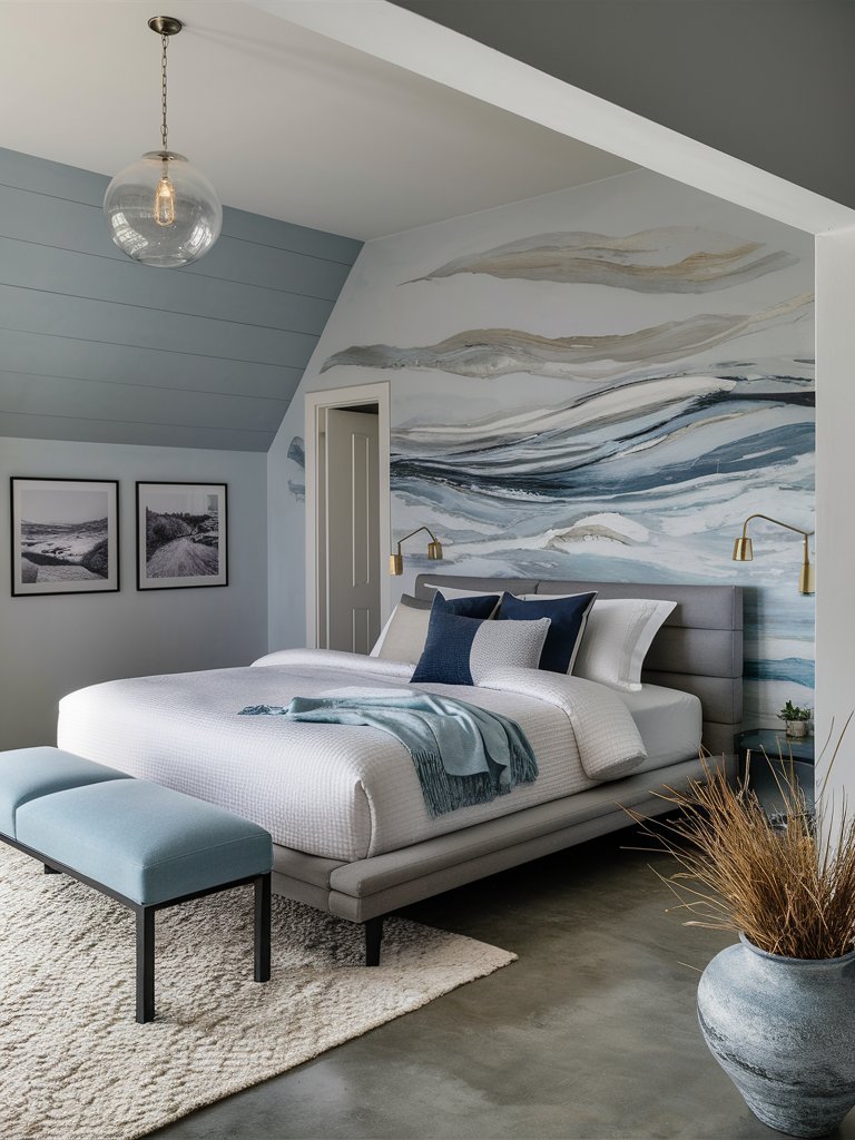 The wall mural behind the bed is the standout feature of this bedroom, artfully mimicking the movement of ocean waves and the layered hues of the shore. With its sweeping strokes of blue, beige, and soft white, the mural establishes a strong coastal theme while serving as an immersive piece of art. The gentle, flowing lines evoke a sense of calm, instantly transporting you to a tranquil seaside setting.