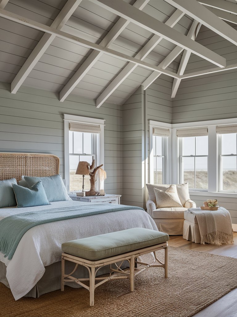 The palette ensures that the room feels airy and expansive, a nod to the open, infinite quality of the coast itself. It’s a perfect example of how the right colors can transform a room into a serene sanctuary, transporting the occupants to a relaxing seaside retreat.