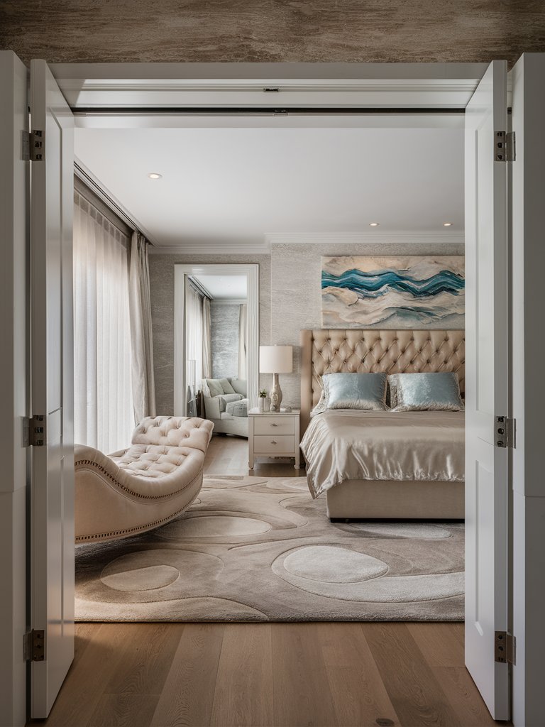 The room opens with wide double doors, immediately creating an impression of grandeur and inviting curiosity to step inside. This entrance functions as more than just a passage, it serves as a frame for the serene oasis that lies beyond. Its symmetry and spaciousness establish a balanced tone, preparing the guest for the thoughtful design elements within.