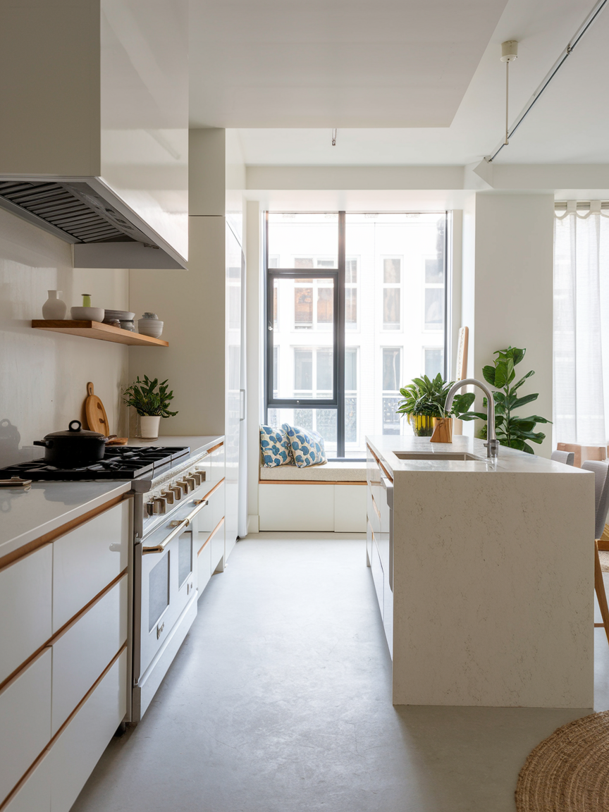 Window sills are often overlooked but can serve as valuable mini storage or display areas in a small kitchen. They are ideal for placing small potted herbs, decorative jars, or compact plants that bring a touch of greenery into the space. Utilizing this area helps free up counter space while adding a natural and refreshing element to the kitchen. Even in apartments with limited window space, a well-styled sill can enhance both practicality and visual appeal. This simple addition helps ensure that every available surface contributes to the overall efficiency of your kitchen layout.