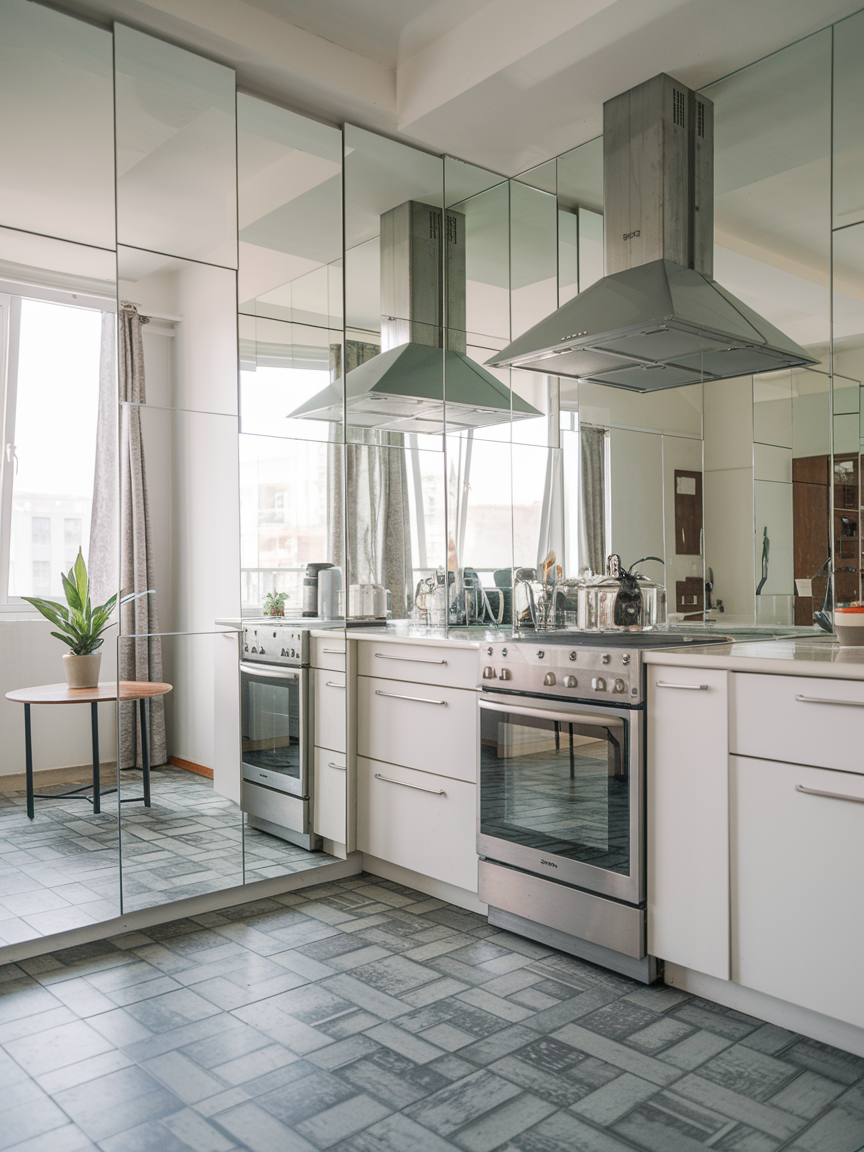 Mirrors are a clever design element that can make a compact kitchen feel significantly larger. When used as a backsplash or wall feature, mirrors reflect light and surrounding elements, creating the illusion of expanded space. This reflective quality enhances brightness and adds a subtle sense of depth. In addition to their spatial benefits, mirrors introduce a sleek and modern aesthetic that can elevate the overall look of the kitchen. Placing them strategically near light sources maximizes their effectiveness while contributing to a more open and inviting environment.