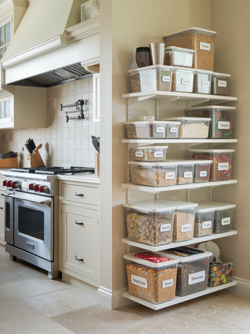 Stackable containers are essential for creating a well-organized pantry. They maximize vertical space, keep items neatly separated, and prevent clutter from building up. Clear containers make it easy to see what’s inside, while labels ensure everything is easy to identify. This system not only improves efficiency but also creates a cohesive and polished look. It helps you stay on top of your inventory, reducing food waste and making grocery shopping more intentional.