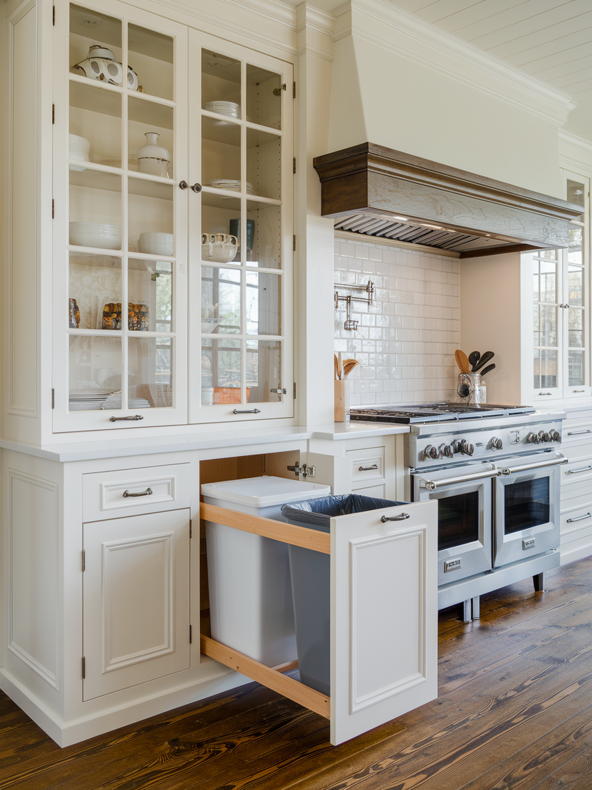Slide-out trash and recycling bins keep waste hidden while maintaining easy access. Installed inside cabinets, they create a cleaner and more organized look while improving hygiene. This system also helps separate recyclables or compost, making your kitchen more efficient and environmentally friendly. It simplifies daily routines and ensures that waste management blends seamlessly into your kitchen design.