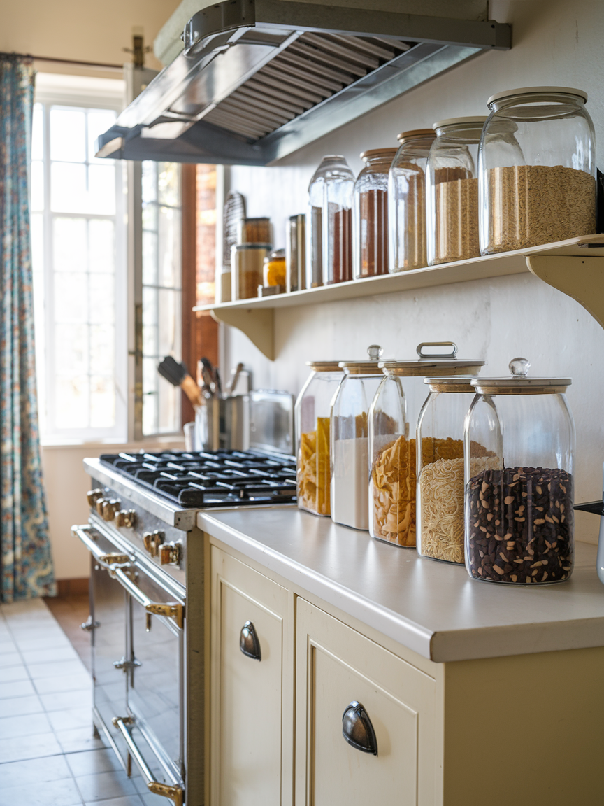 Clear storage jars combine functionality with visual appeal, making them a favorite for organized kitchens. They allow you to see contents at a glance, reducing the time spent searching for ingredients. Perfect for dry goods, snacks, or spices, they also help maintain freshness. When paired with labels, they create a uniform and aesthetically pleasing look that elevates your pantry and makes it feel more refined.
