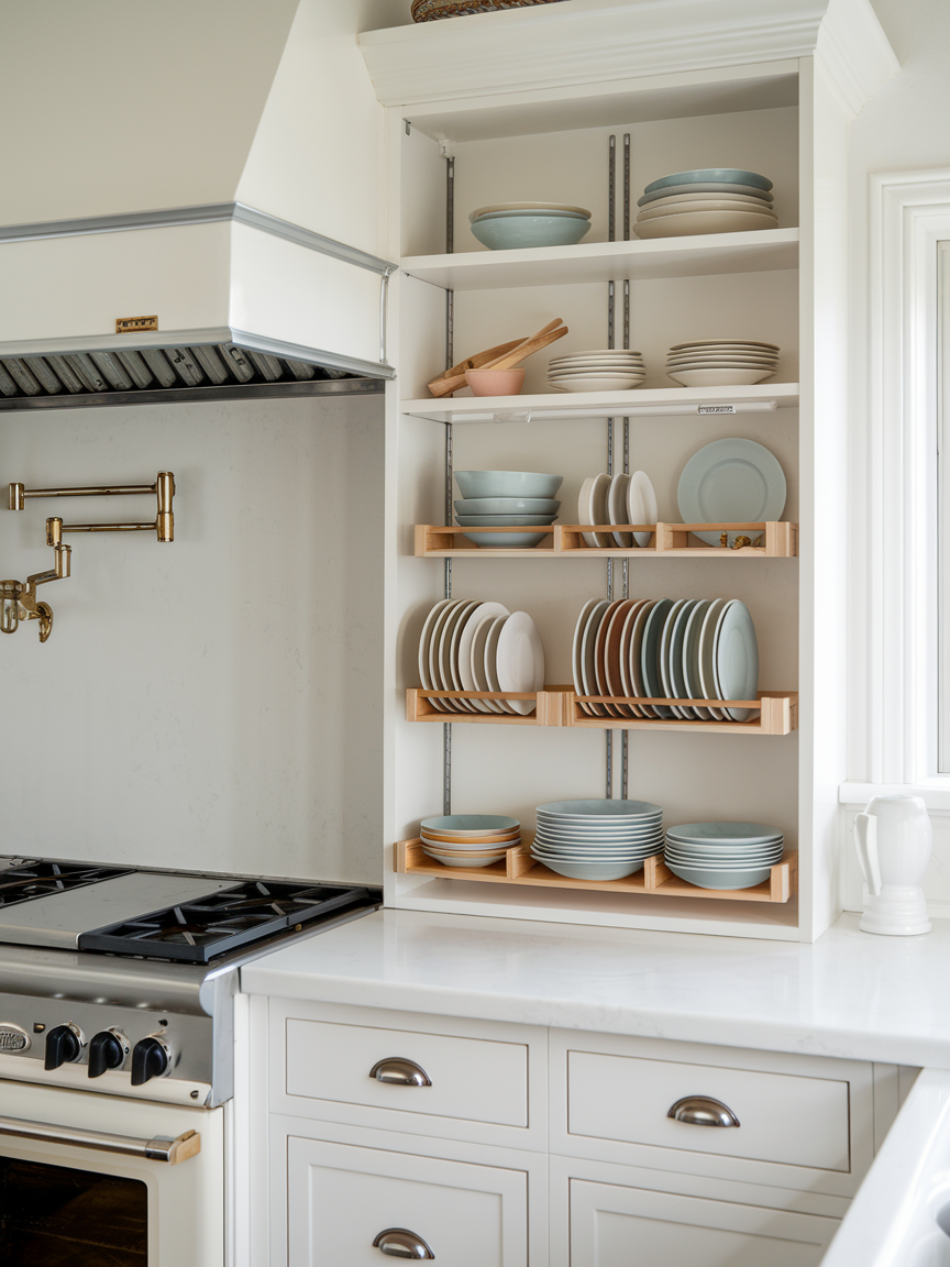 Organizing plates and bowls with dedicated cabinet systems prevents stacking chaos and improves accessibility. Dividers or racks keep items upright and separated, making them easier to grab while reducing the risk of chips or scratches. This method maximizes vertical space and creates a more structured storage system. The result is a kitchen that feels more organized, efficient, and enjoyable to use every day.