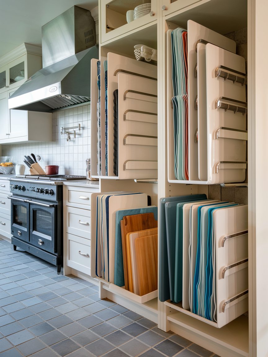 Storing baking sheets, cutting boards, and trays vertically is a simple upgrade that delivers immediate results. Instead of stacking these items on top of each other and struggling to pull one out, vertical dividers allow you to slide each piece in and out effortlessly. This not only saves time during meal prep but also protects your cookware from scratches and damage. It maximizes cabinet space by utilizing height rather than depth, making the entire storage area feel more organized. Once implemented, this method creates a sense of order that makes even the busiest kitchens feel more efficient and thoughtfully arranged.