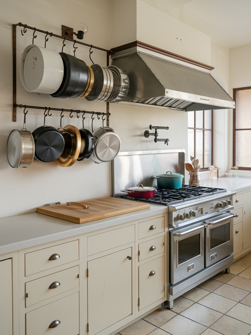 Hanging pot racks are both practical and visually appealing, offering a smart way to free up cabinet space while showcasing your cookware. By suspending pots and pans from the ceiling or mounting them on a wall, you create easy access to frequently used items without digging through crowded cabinets. This solution works especially well for avid cooks who need quick access during meal preparation. Beyond functionality, it adds a professional and stylish touch to your kitchen, turning everyday cookware into part of the décor while maintaining an organized and efficient layout.