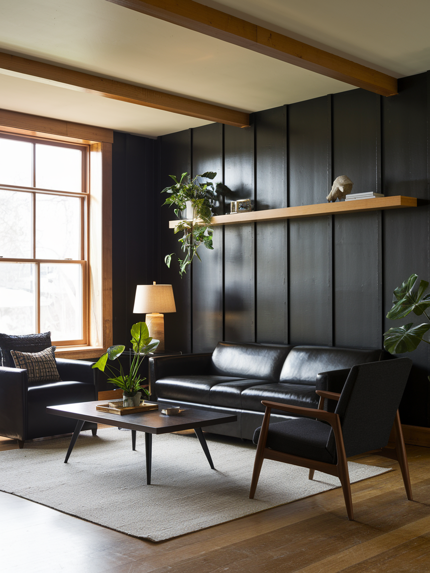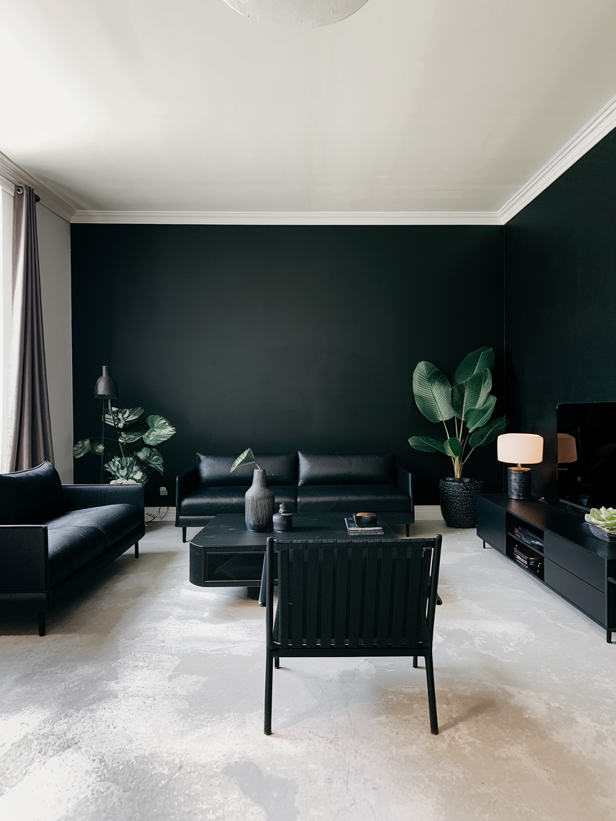 A black accent wall is a perfect entry point for incorporating bold design without committing to an entirely dark space. It introduces depth and creates a strong focal point that naturally draws the eye, especially when placed behind a sofa, fireplace, or media unit. This single wall anchors the entire room, giving it structure and a sense of intentional design. When paired with lighter furniture, metallic finishes, or textured decor, the contrast feels balanced rather than heavy. Choosing a matte or soft satin finish can also influence the mood, with matte offering a modern softness and a slight sheen adding subtle dimension. This approach allows you to experiment confidently while maintaining a bright and inviting atmosphere.