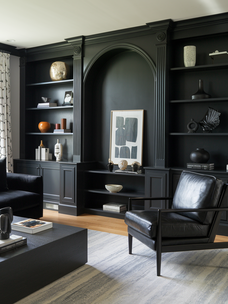Black built-in shelving introduces both function and architectural depth, transforming ordinary storage into a striking design feature. The dark backdrop allows books, ceramics, artwork, and decorative objects to stand out with greater clarity and contrast, creating a curated, gallery-like effect. Incorporating integrated lighting within the shelves enhances dimension and prevents the space from feeling too heavy or flat. This approach works especially well in modern and transitional interiors, where clean lines and thoughtful styling are key. When balanced with a mix of textures, such as greenery, metals, and natural materials, the shelving feels layered and intentional rather than overwhelming.