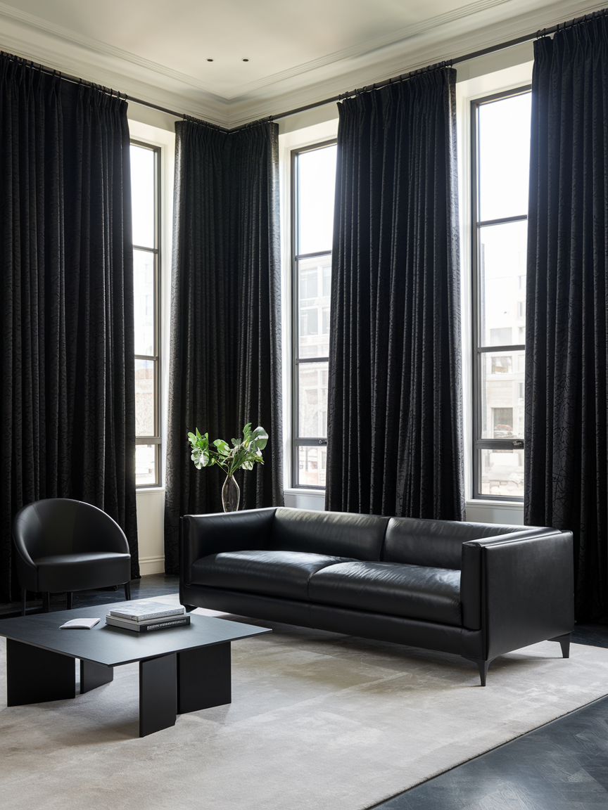 Black curtains offer a refined way to introduce drama while maintaining elegance and softness. Hung from ceiling height, they create the illusion of taller walls and add a sense of structure to the room. The choice of fabric plays an important role—linen blends bring a relaxed feel, while velvet adds a luxurious touch. When paired with lighter walls, black curtains provide contrast without making the space feel dark. They also improve light control and privacy, making them as functional as they are stylish. This simple addition can instantly elevate the overall look of the living room with minimal effort.