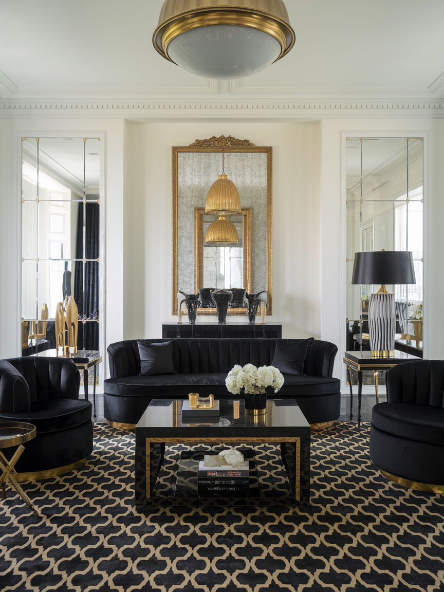 The combination of black and gold creates a sophisticated palette that feels timeless and elevated. Black provides depth and grounding, while gold accents introduce warmth and a subtle reflective quality that brightens the space. Elements such as lighting fixtures, mirror frames, or decorative accessories can be used to incorporate gold in a restrained way. The key is balance—keeping gold accents minimal ensures the design feels refined rather than overly ornate. This pairing works beautifully in both contemporary and classic interiors, resulting in a living room that feels polished, elegant, and intentionally styled.