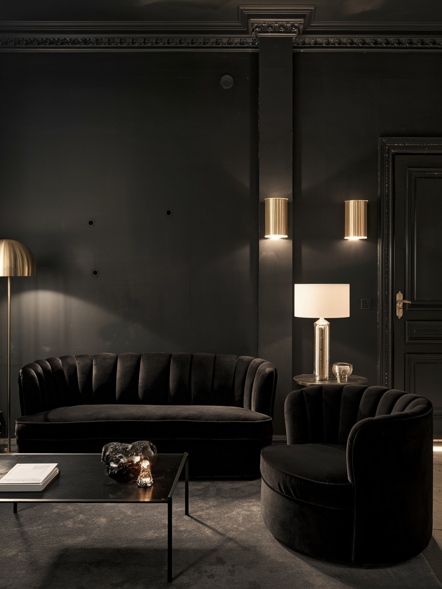 7. Embrace All-Black Walls with Layered Lighting