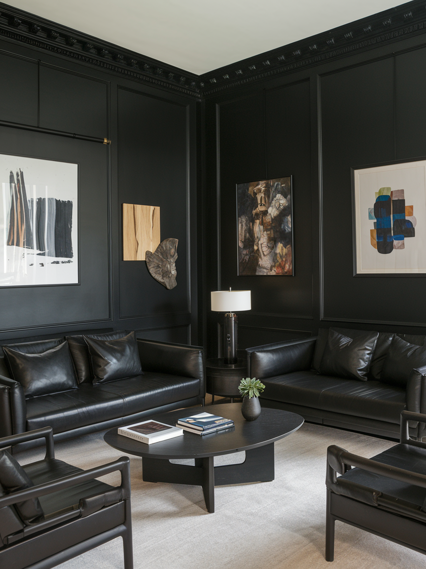 All-black walls create a cocoon-like environment that feels luxurious, intimate, and incredibly stylish when executed with care. The key to making this bold choice successful is layering different types of lighting throughout the room. Ambient lighting establishes a base glow, while table lamps, floor lamps, and accent lights introduce warmth and depth. Since black absorbs light, using warm-toned bulbs helps soften the intensity and create a welcoming ambiance. Textures become especially important in this setting—velvet, leather, woven fabrics, and metallic accents stand out beautifully against the dark backdrop. When done correctly, an all-black room feels dramatic yet cozy, offering a refined space that encourages relaxation.