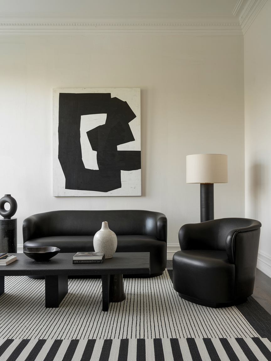 The pairing of black and white creates a crisp, classic look that feels both modern and timeless. This high-contrast combination provides clarity and structure, making the space feel intentional and well-balanced. White walls or large surfaces help reflect light and keep the room feeling open, while black elements add depth and definition. Introducing subtle patterns, such as striped rugs, geometric cushions, or graphic artwork, adds visual interest without cluttering the design. The beauty of this palette lies in its versatility, allowing you to easily update the space with small accents while maintaining a sophisticated and cohesive aesthetic.