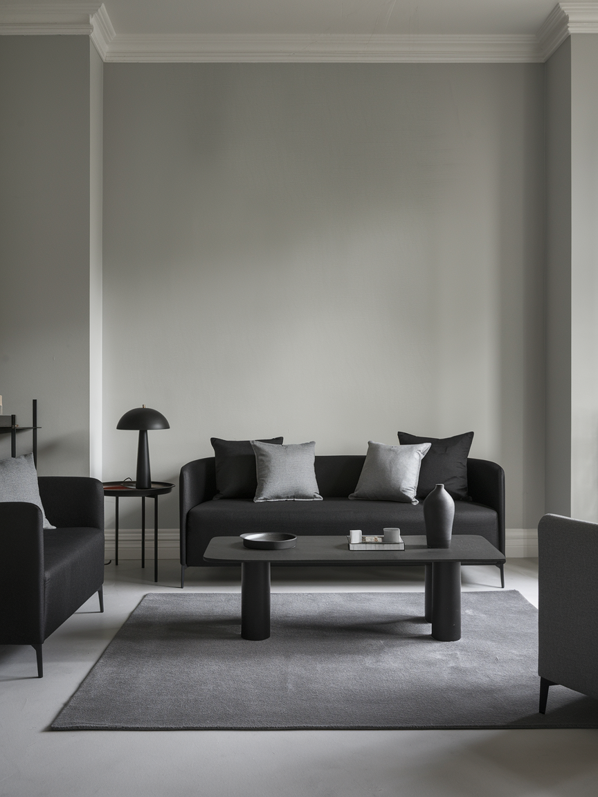Combining black with shades of gray creates a layered, moody palette that feels both calming and sophisticated. Gray acts as a gentle transition between bold black elements and lighter accents, softening the overall look while maintaining depth. Lighter grays can open up the space, while darker charcoal tones enhance the cozy, enveloping feel. Incorporating textiles such as throws, rugs, and upholstered pieces adds warmth and prevents the palette from feeling cold. This combination is ideal for creating a refined environment that feels modern yet comfortable, offering a subtle alternative to high-contrast designs.