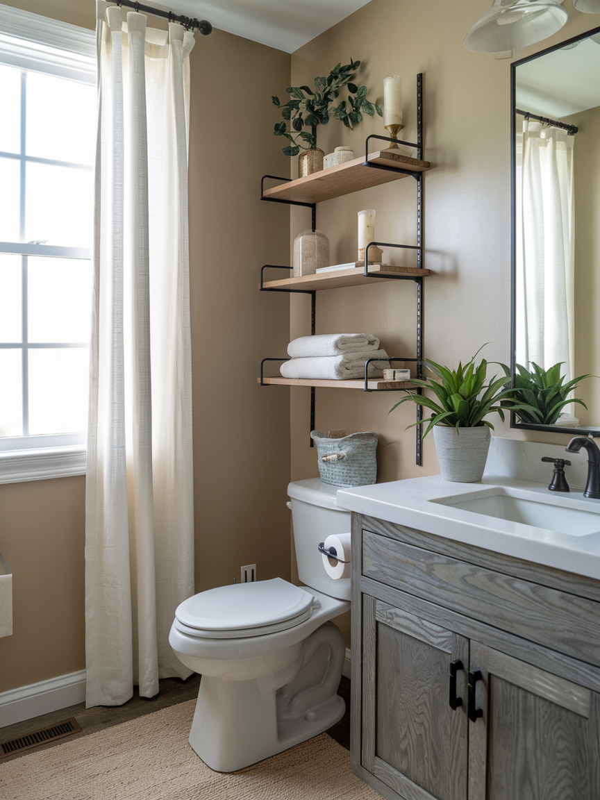 Floating shelves are like the MVPs of small bathrooms. They use wall space that usually sits empty while keeping the floor clear. Stack them above the toilet or next to the mirror for a spot to store towels, jars, or even cute plants. The best part? They double as decor since you can style them with baskets or candles. Think of them as storage that shows off your personality while also keeping the clutter in check. Honestly, they’re one of the easiest upgrades with the biggest payoff.