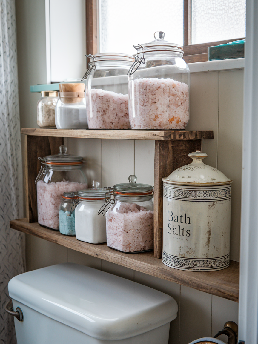 Storage doesn’t always have to be hidden. Decorative jars and canisters are great for everyday items like cotton balls, Q-tips, or bath salts. They keep things accessible while adding a touch of charm to your counter or shelves. Glass, ceramic, or even labeled vintage-style jars all work, depending on your vibe. It’s a simple way to turn basic storage into something that feels intentional and stylish.
