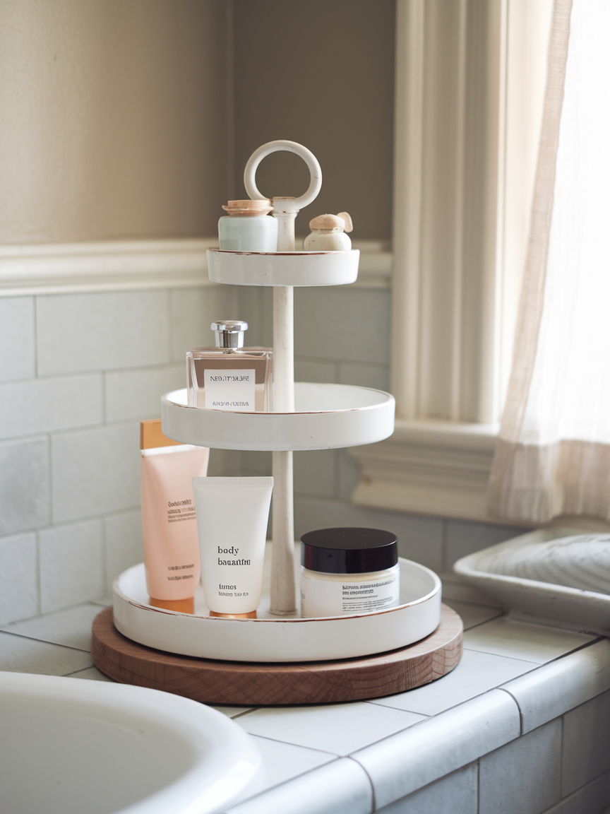 Counter space is precious in small bathrooms, which is why tiered trays are such a genius solution. They let you stack up instead of spreading out, which means more space without sacrificing your favorite skincare lineup. Think of it like a mini dessert stand but for your lotions, perfumes, and everyday essentials. It keeps everything accessible yet contained, so your counter doesn’t look like a drugstore exploded. Bonus: tiered trays add a little visual charm and give your bathroom a boutique-like vibe.