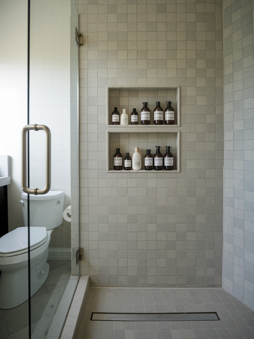 If your shower is currently hosting a lineup of bottles along the floor or a wobbly caddy, it’s time to step it up with a built-in niche. These recessed shelves keep your shampoos, conditioners, and soaps neatly tucked away without eating into your shower space. They look sleek, modern, and much more intentional than balancing bottles on the tub edge. Plus, you can customize the size and even add accent tiles to make it a stylish feature.
