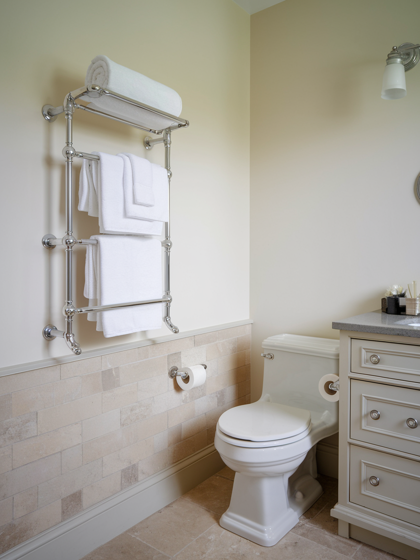 Instead of piling towels on the counter or cramming them into a tiny cabinet, wall-mounted racks give you easy storage that looks chic. You can roll towels spa-style or hang them neatly for a polished look. They’re especially handy in bathrooms without linen closets. Add one above the toilet or next to the vanity to keep towels within reach without taking up valuable floor space. It’s practical, but it also makes your bathroom look instantly more put-together.