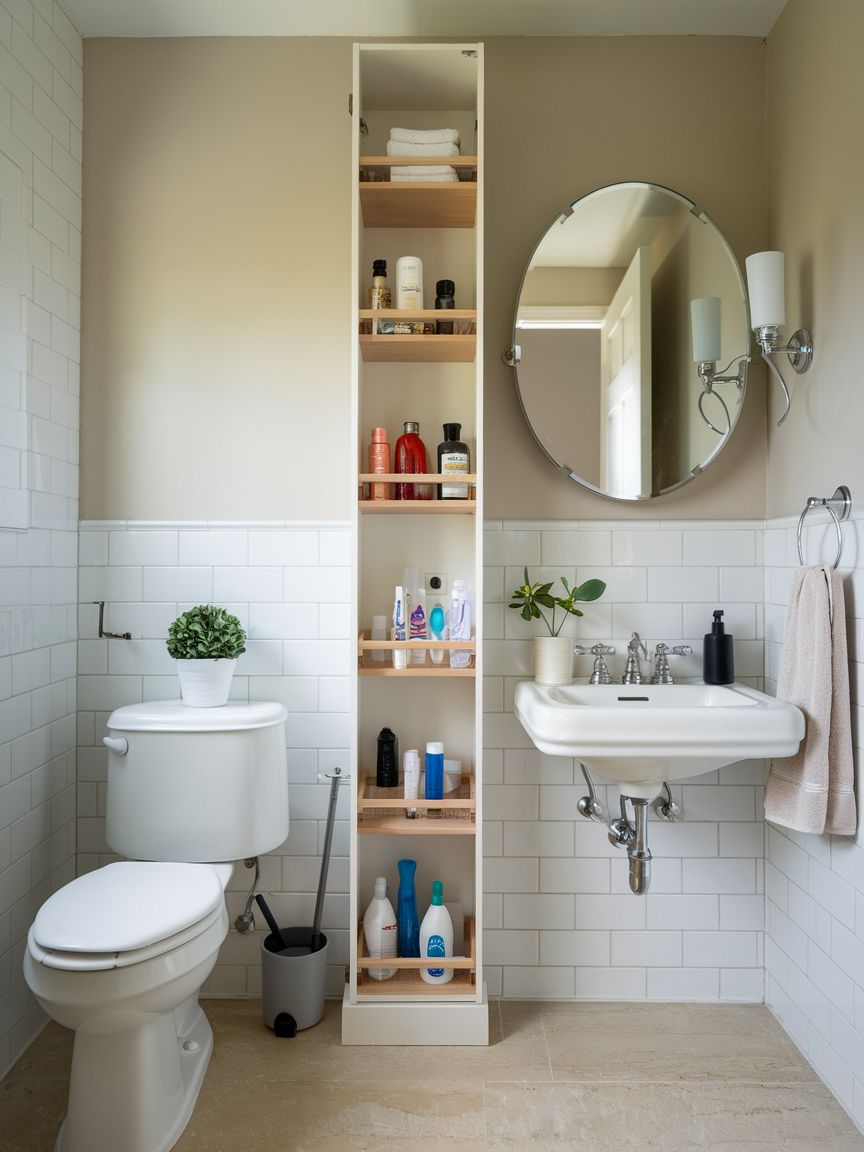 Bathrooms often have those weird little gaps between the sink and wall where nothing fits… except a slim cabinet. These tall, narrow storage units are designed for awkward spaces and can hold toiletries, cleaning supplies, or even a stash of extra TP rolls. It’s like finding secret square footage you didn’t know you had. And because they’re slim, they don’t overwhelm the room visually. It’s basically sneaky storage at its best.
