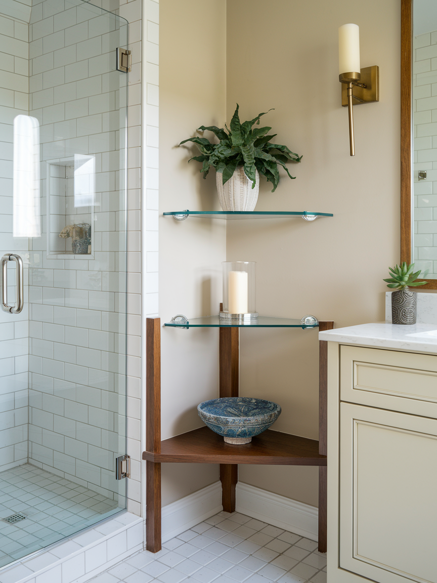 Corners are often wasted space, but corner shelves prove otherwise. They fit snugly and give you extra room for decor, baskets, or toiletries without sticking out awkwardly. Glass corner shelves look sleek and modern, while wooden ones add warmth. They’re especially useful in showers or next to vanities where space is tight. It’s one of those small upgrades that makes you wonder why you didn’t try it sooner.