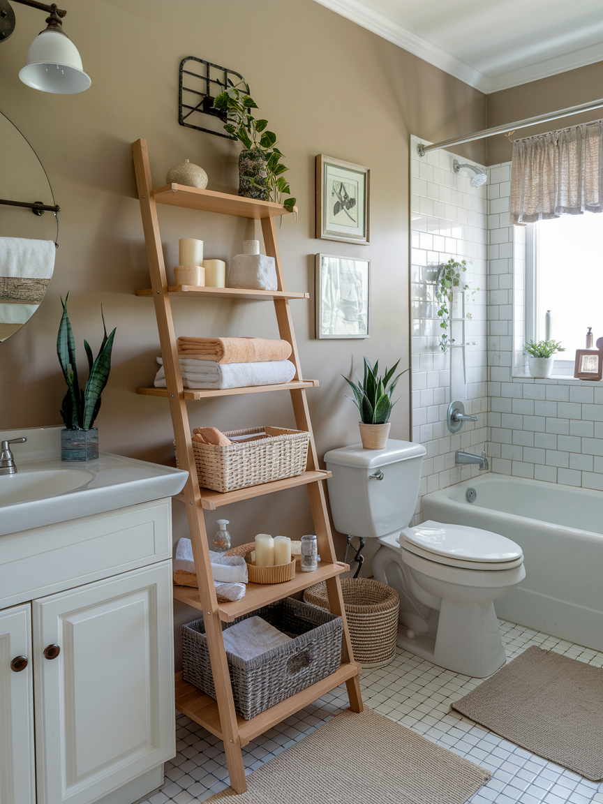 Ladder shelves aren’t just trendy, they’re practical too. They lean against the wall, so they don’t eat up much floor space, and they give you multiple tiers for storage. Towels, baskets, candles, and even small trays all find a perfect spot here. They’re especially great in bathrooms where you don’t want bulky cabinets. Plus, they give the space a relaxed, spa-like vibe without much effort. It’s kind of like adding storage with style points built in.