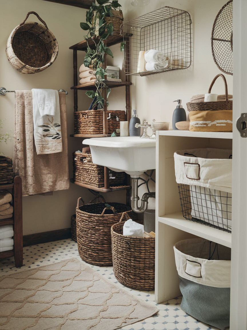 When in doubt, baskets solve almost any bathroom storage problem. You can tuck them under the sink, stack them on shelves, or even hang them on the wall. They’re perfect for organizing smaller items like lotions, hair tools, and washcloths. And the best part? They hide clutter while still looking stylish. Go for woven, wire, or fabric baskets depending on your bathroom’s vibe. You can even label them if you’re feeling extra organized, though I won’t judge if you don’t.