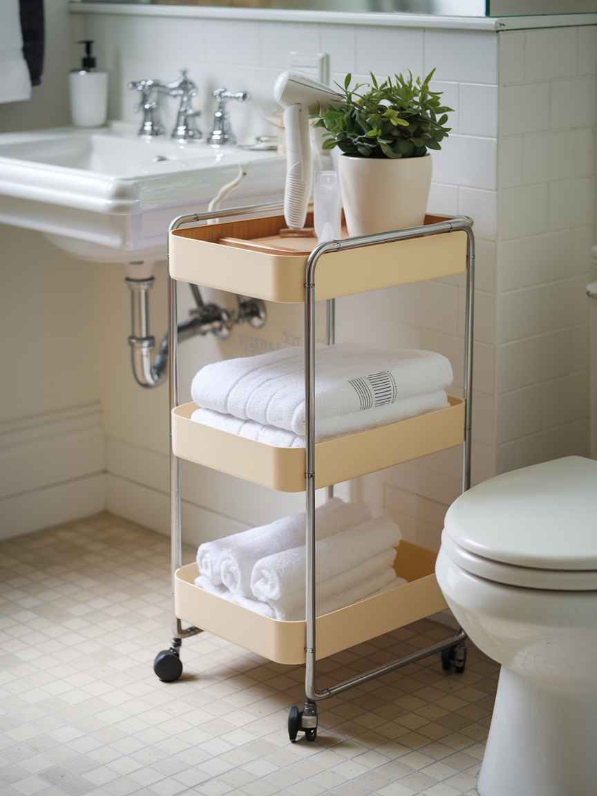 A slim rolling cart is a lifesaver for bathrooms short on space. It can slide between the sink and toilet or tuck neatly into a corner. Use it to hold towels, toiletries, or even your hair dryer station. The beauty is that it’s mobile, so you can wheel it out when you need it and hide it when you don’t. Bonus points if you grab one with multiple tiers and a cute finish that adds personality to your space.