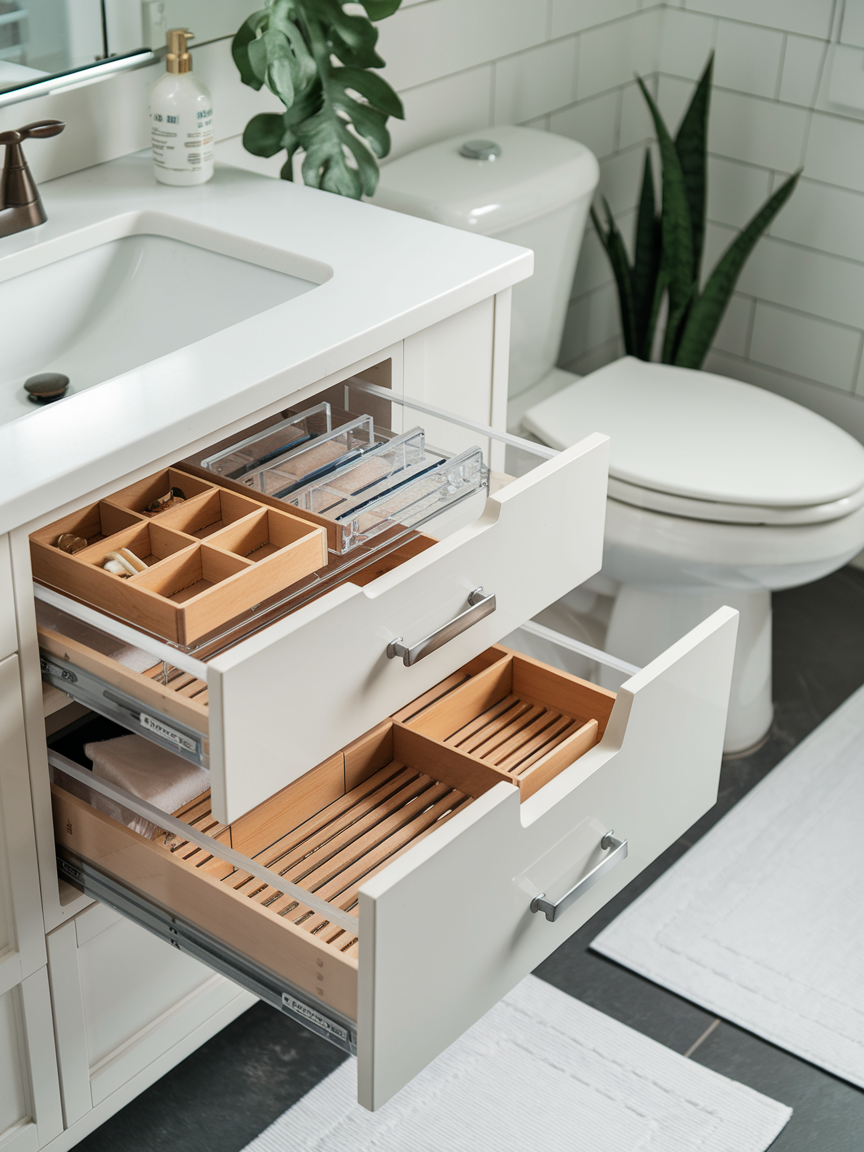 Let’s be honest, bathroom drawers can easily become black holes of chaos. Drawer organizers are the secret to fixing that. You can sort your makeup, brushes, and everyday essentials into neat little compartments so you’re not digging for eyeliner when you’re already late. Clear acrylic organizers or bamboo dividers are both stylish and functional. Suddenly, your morning routine feels way less stressful.