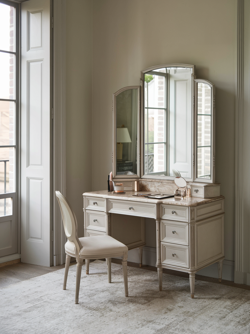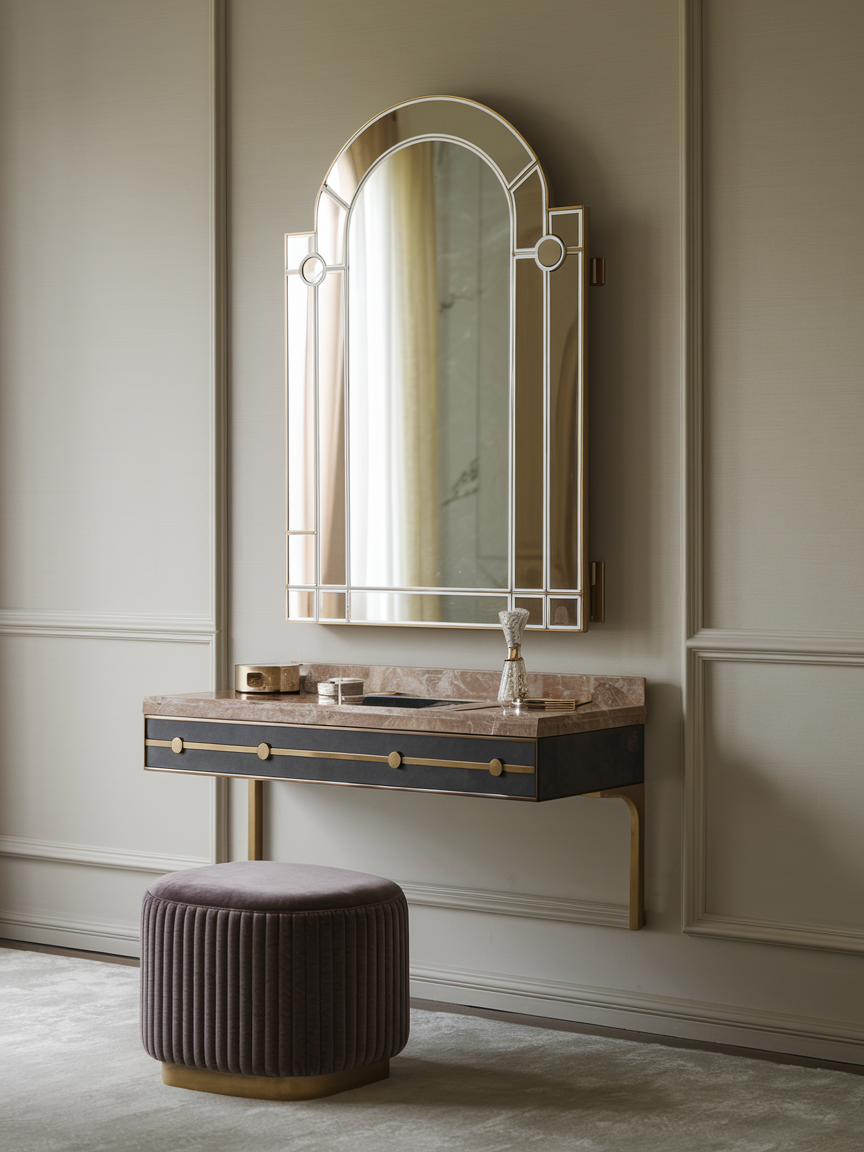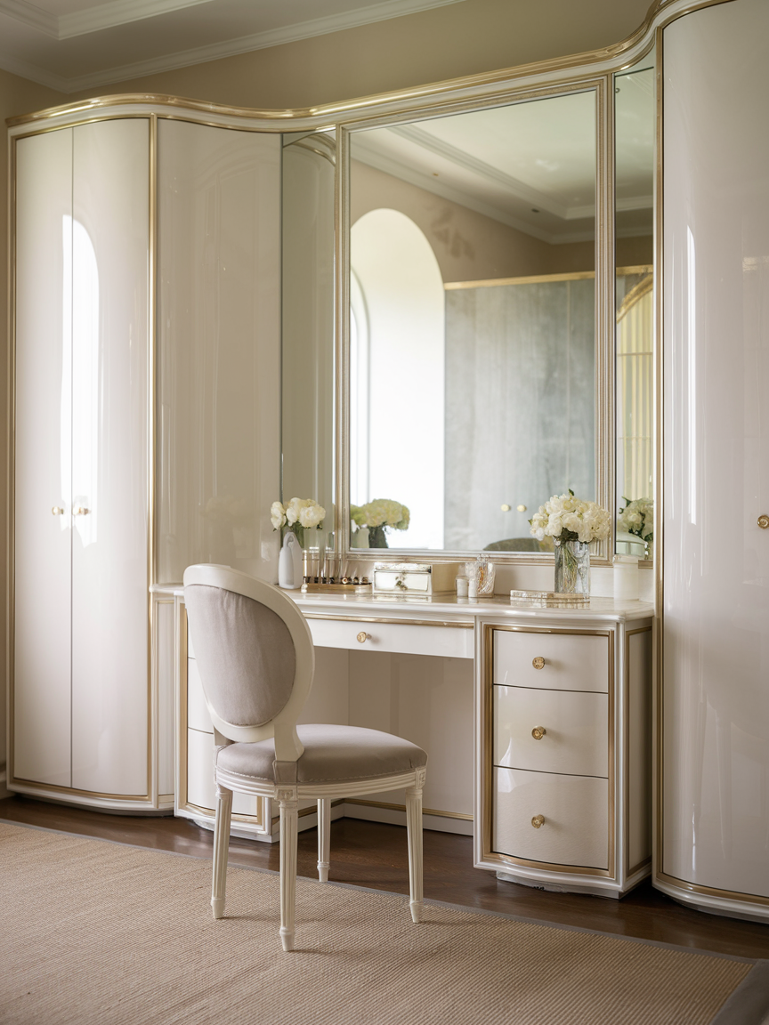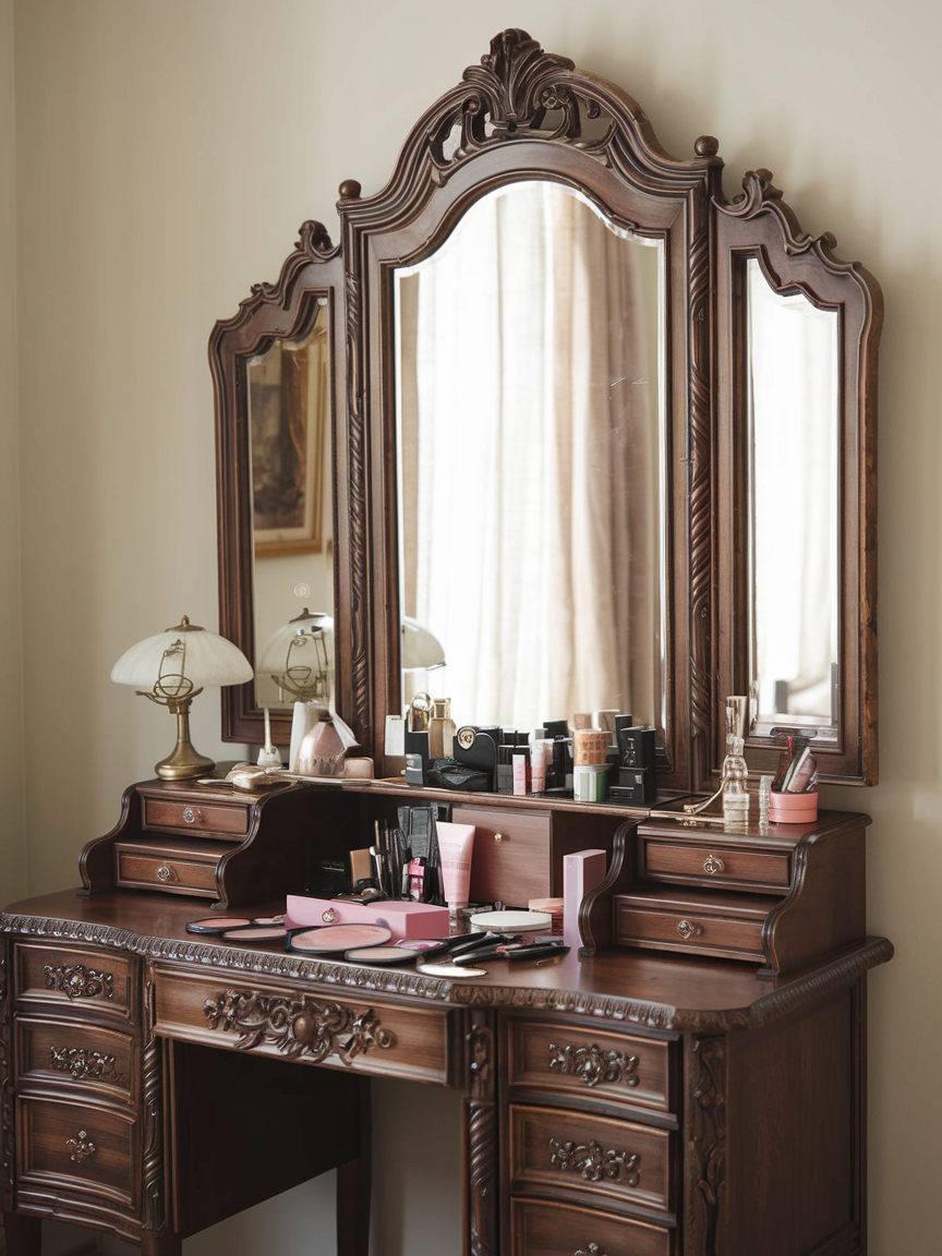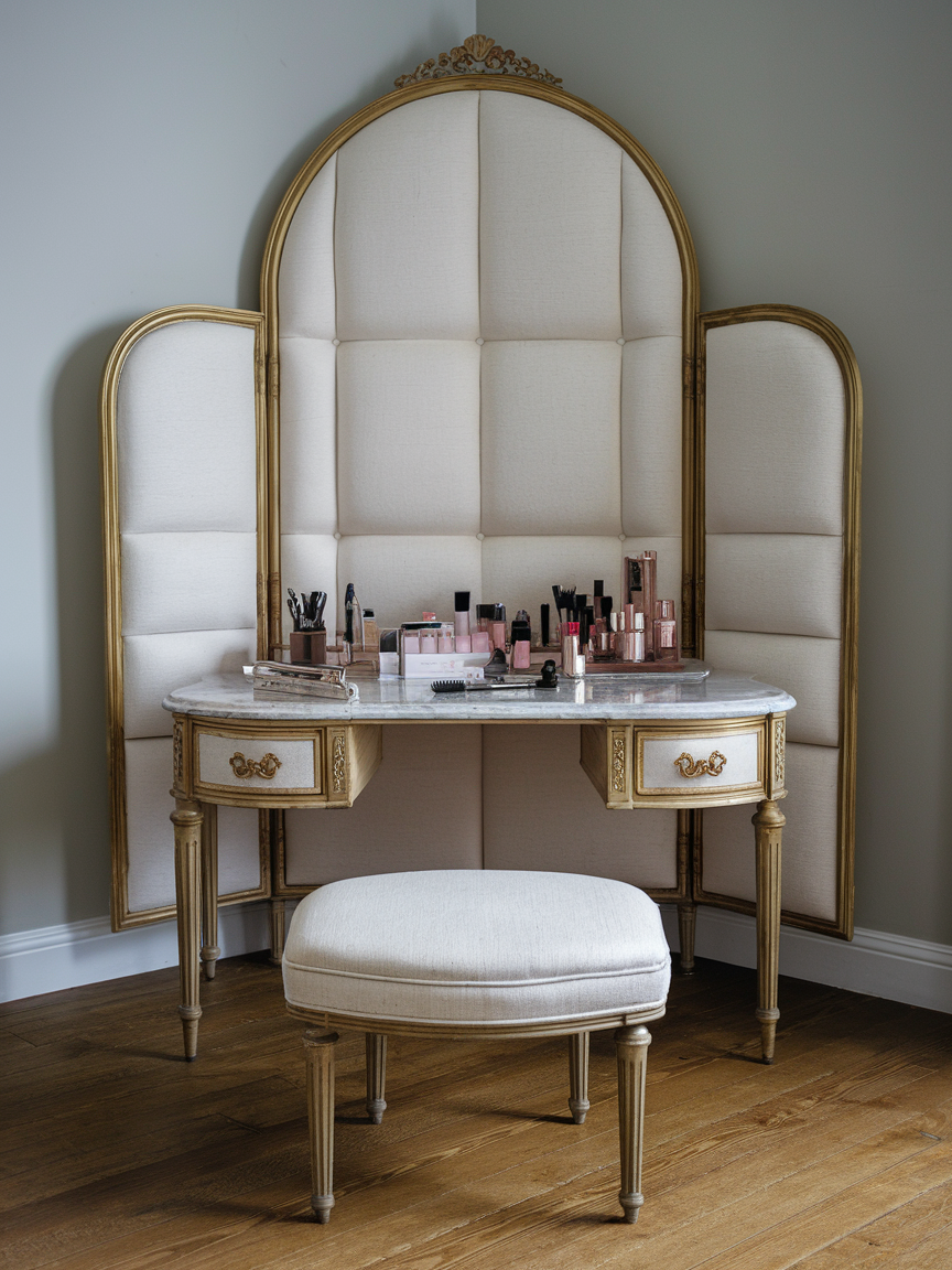 An antique-inspired vanity table introduces character and timeless charm to your beauty setup. Intricate carvings, curved legs, or distressed finishes add depth and personality while maintaining elegance. Balancing vintage elements with modern lighting or a sleek mirror prevents the space from feeling outdated. Soft neutral paint colors such as ivory or muted gray enhance the romantic aesthetic. This blend of old-world detail and contemporary refinement creates a vanity that feels unique, curated, and full of charm. The result is a sophisticated space that honors classic beauty while remaining functional for modern routines.