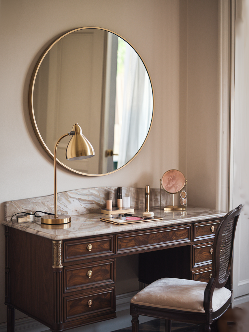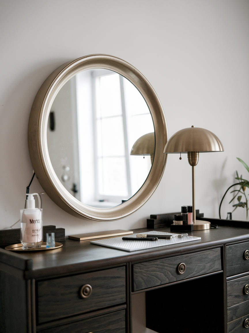 A statement round mirror softens the angles of a vanity setup and introduces graceful symmetry into the space. The circular shape contrasts beautifully with rectangular tables and drawers, creating visual balance that feels refined and intentional. Choosing a thin metallic frame in gold, black, or brushed nickel enhances modern sophistication without overwhelming the design. A larger round mirror can also make a small area feel more expansive by reflecting light and opening up the room visually. When paired with subtle wall sconces or backlighting, the mirror becomes a glowing focal point that elevates the entire beauty corner. This combination of elegance and practicality ensures your vanity feels thoughtfully curated, timeless, and effortlessly luxurious.