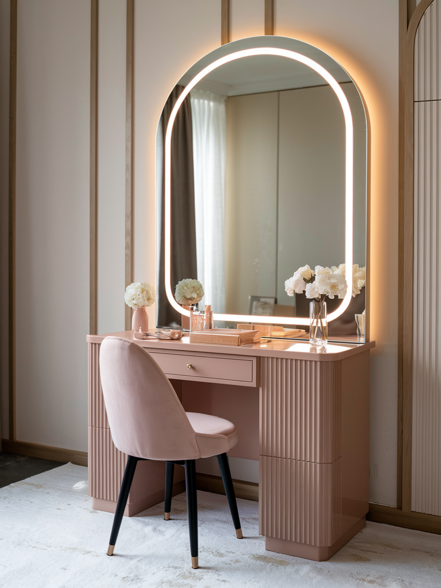 A Hollywood-style lighted mirror transforms any vanity into a glamorous beauty station reminiscent of a professional dressing room. Evenly spaced LED bulbs provide balanced illumination, ensuring flawless makeup application without harsh shadows. Choosing warm white lighting creates a flattering glow that enhances skin tones while maintaining an elegant ambiance. Framing the mirror in sleek metal or soft matte finishes keeps the design modern and refined. The bright yet controlled lighting not only improves functionality but also adds a statement feature to the room. When paired with a clean-lined vanity table and organized storage, a Hollywood-style mirror creates a sophisticated setup that feels both luxurious and practical for everyday use.