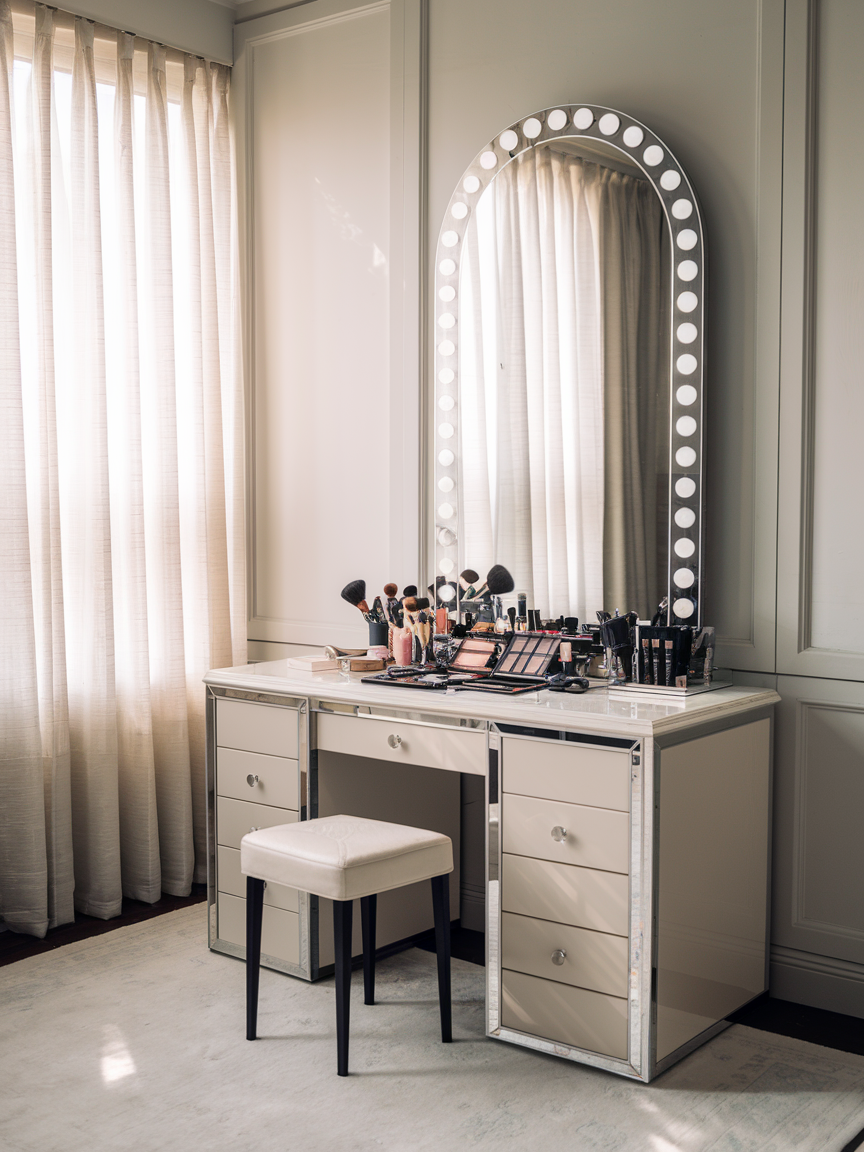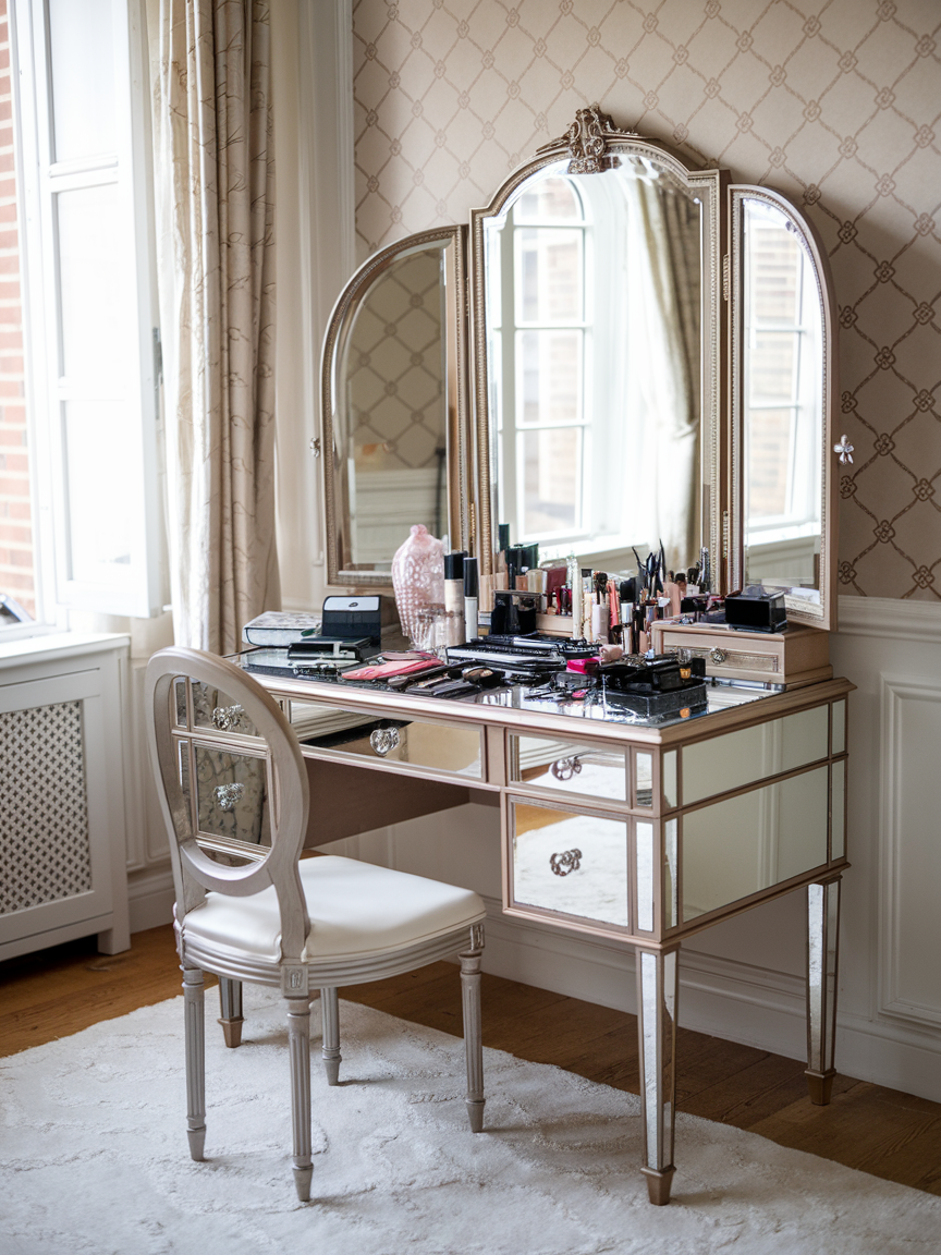 A mirrored vanity table reflects light beautifully, making the room feel brighter and more spacious. The sleek reflective surfaces add instant glamour while maintaining a clean and modern aesthetic. Mirrored furniture pairs effortlessly with crystal accents or metallic décor, enhancing the overall sophistication. To prevent the space from feeling overwhelming, balance reflective elements with soft textures such as upholstered seating or a plush rug. The luminous quality of mirrored surfaces creates a chic and polished beauty corner that feels refined yet inviting, perfect for achieving a glamorous daily routine.
